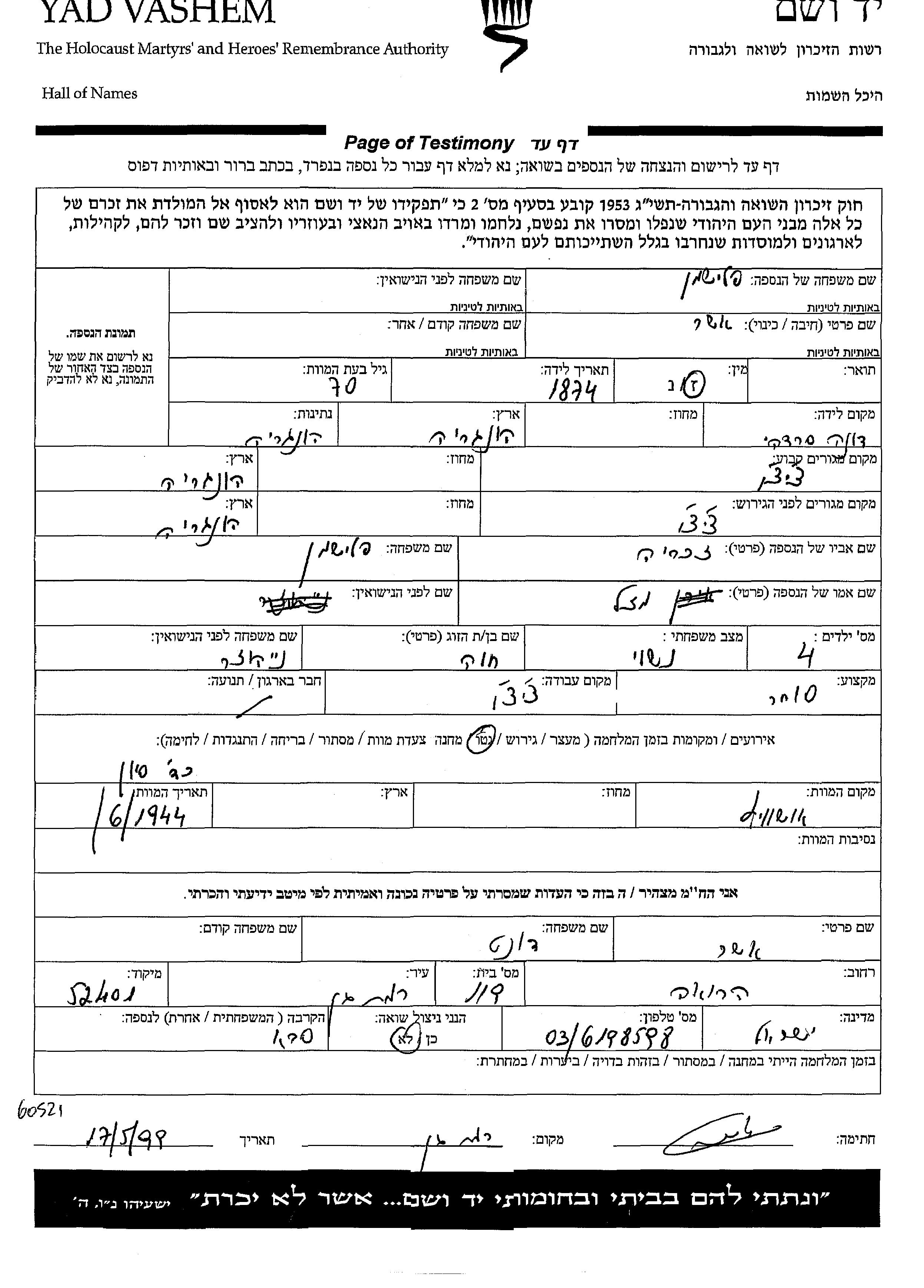 Asher wurde in der Schoah ermordet. Todesort: Auschwitz, Polen im Jahr 06/1944.