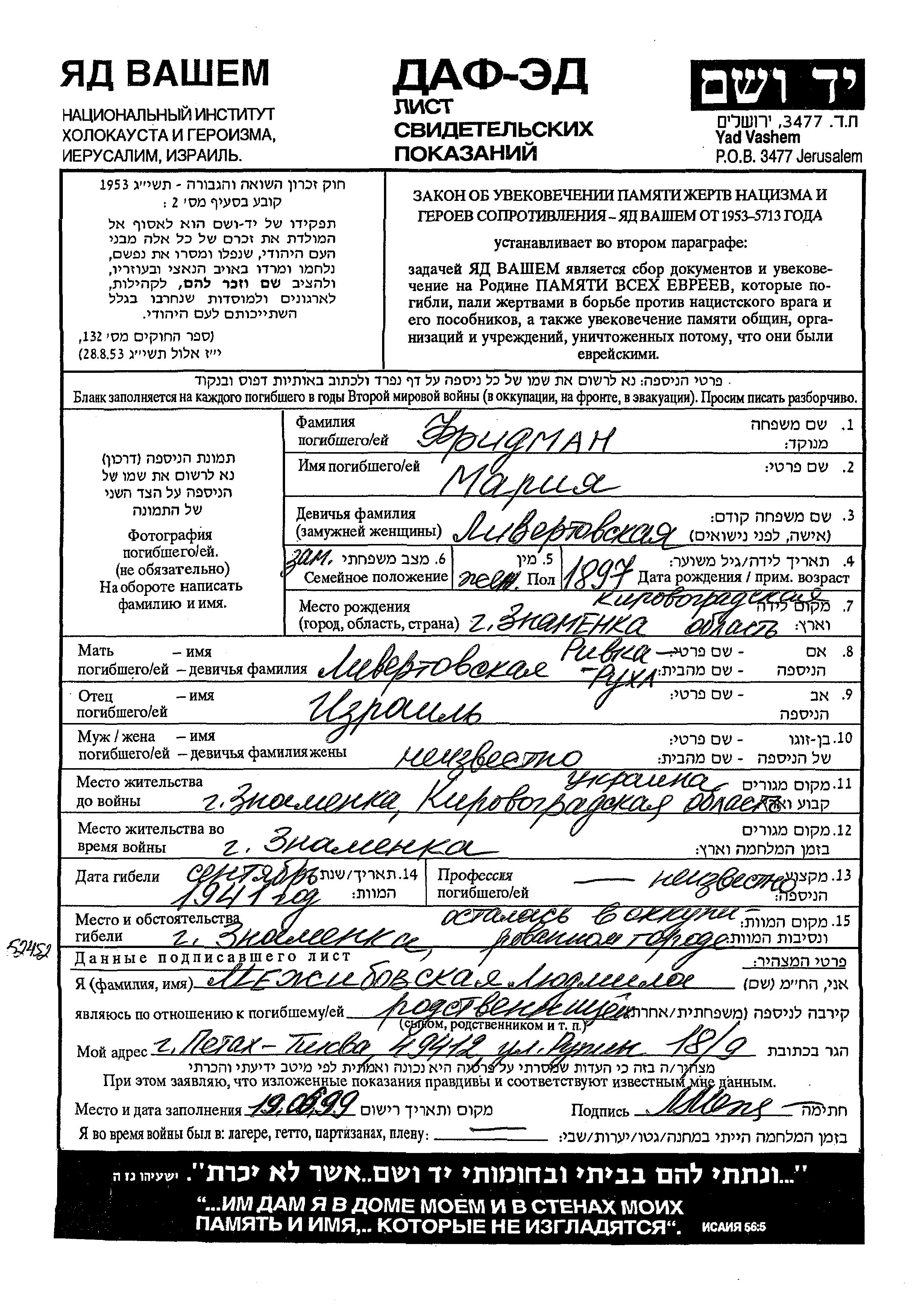 Maria Fridman, geb. Livertovski wurde im Jahr 1897 in Znamenka, Ukraine (UdSSR) geboren. Sie war die Tochter von Izrail und Rivka Rukhl. Sie war Verheiratet. Vor dem Zweiten Weltkrieg lebte sie in Znamenka, Ukraine (UdSSR). Während des Krieges war sie in Znamenka, Ukraine (UdSSR).