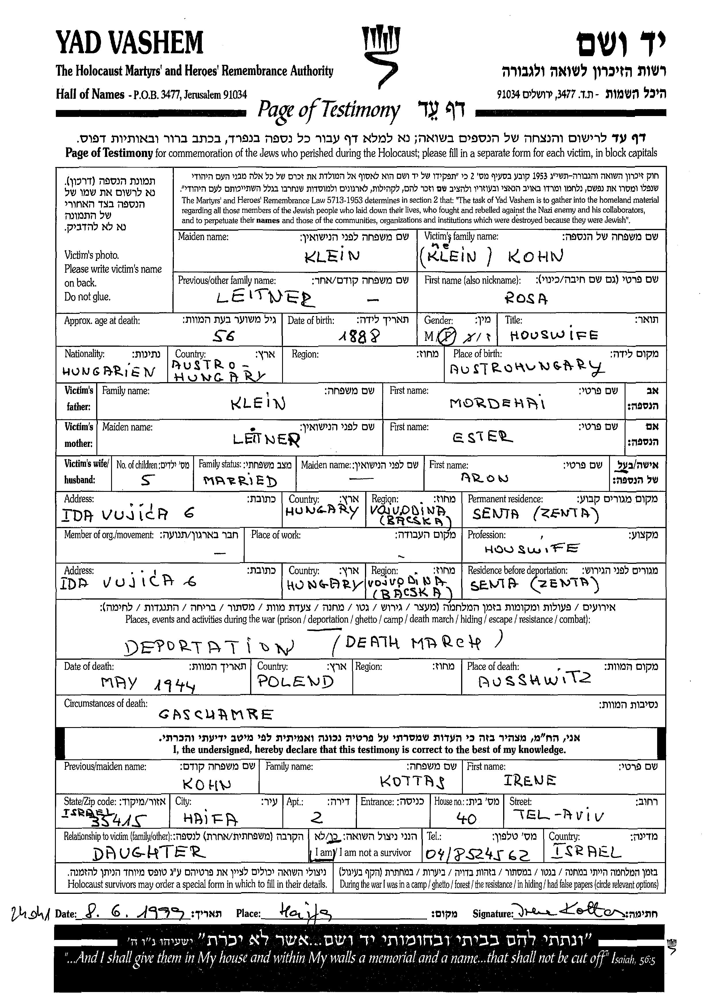 Rosa Kohn Klein, geb. Leitner wurde im Jahr 1888 in Österreich-Ungarn geboren. Sie war die Tochter von Mordehai und Ester. Sie war Hausfrau und mit Aron Verheiratet. Vor dem Zweiten Weltkrieg lebte sie in Senta, Jugoslawien. Während des Krieges war sie in Senta, Jugoslawien.