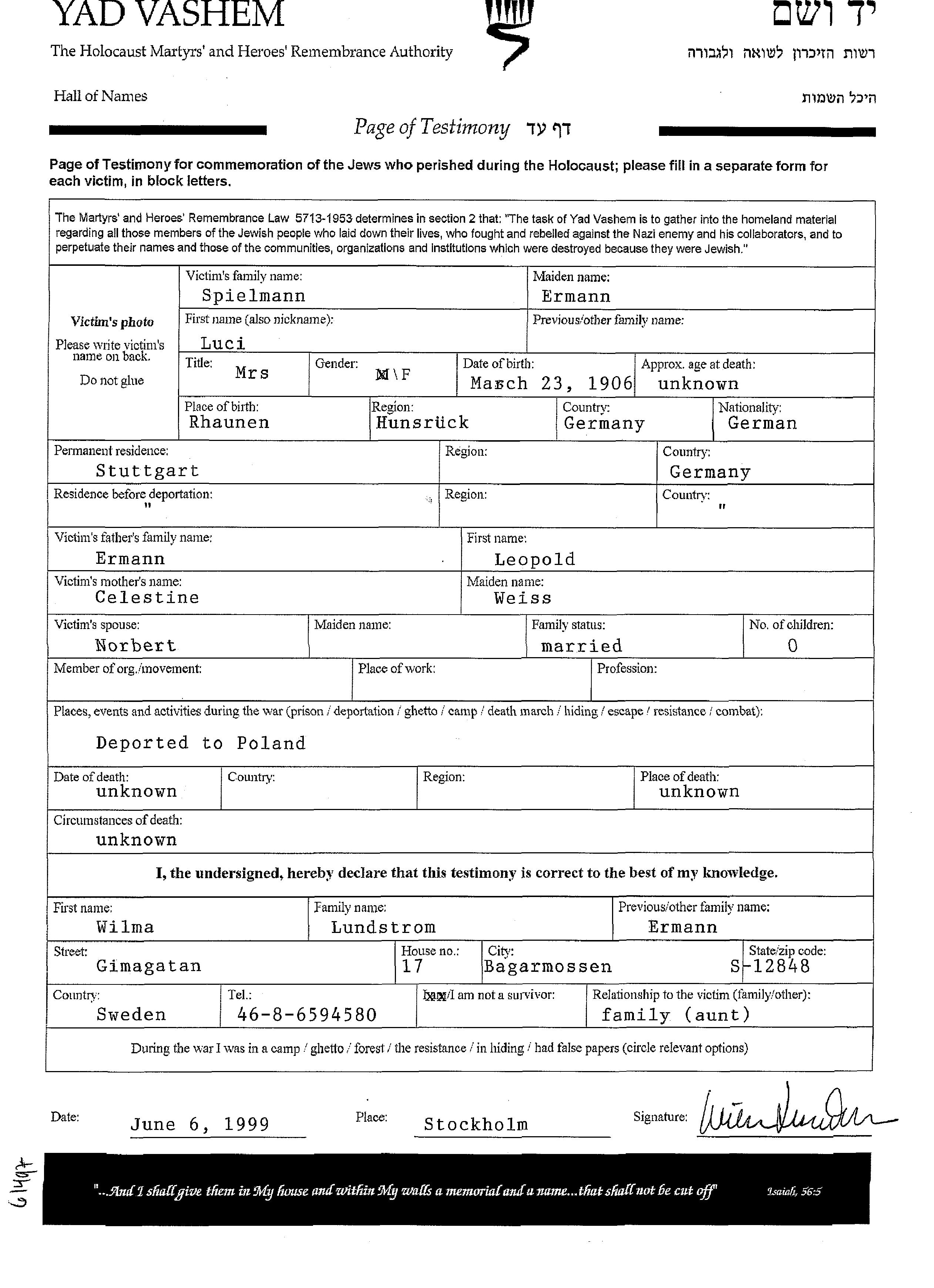 Luci Ermann, geb. Spielmann wurde im Jahr 1906 in Rhaunen, Deutsches Reich geboren. Sie war die Tochter von Leopold und Celestine. Sie war mit Norbert Verheiratet. Vor dem Zweiten Weltkrieg lebte sie in Stuttgart, Deutsches Reich. Während des Krieges war sie in Stuttgart, Deutsches Reich.