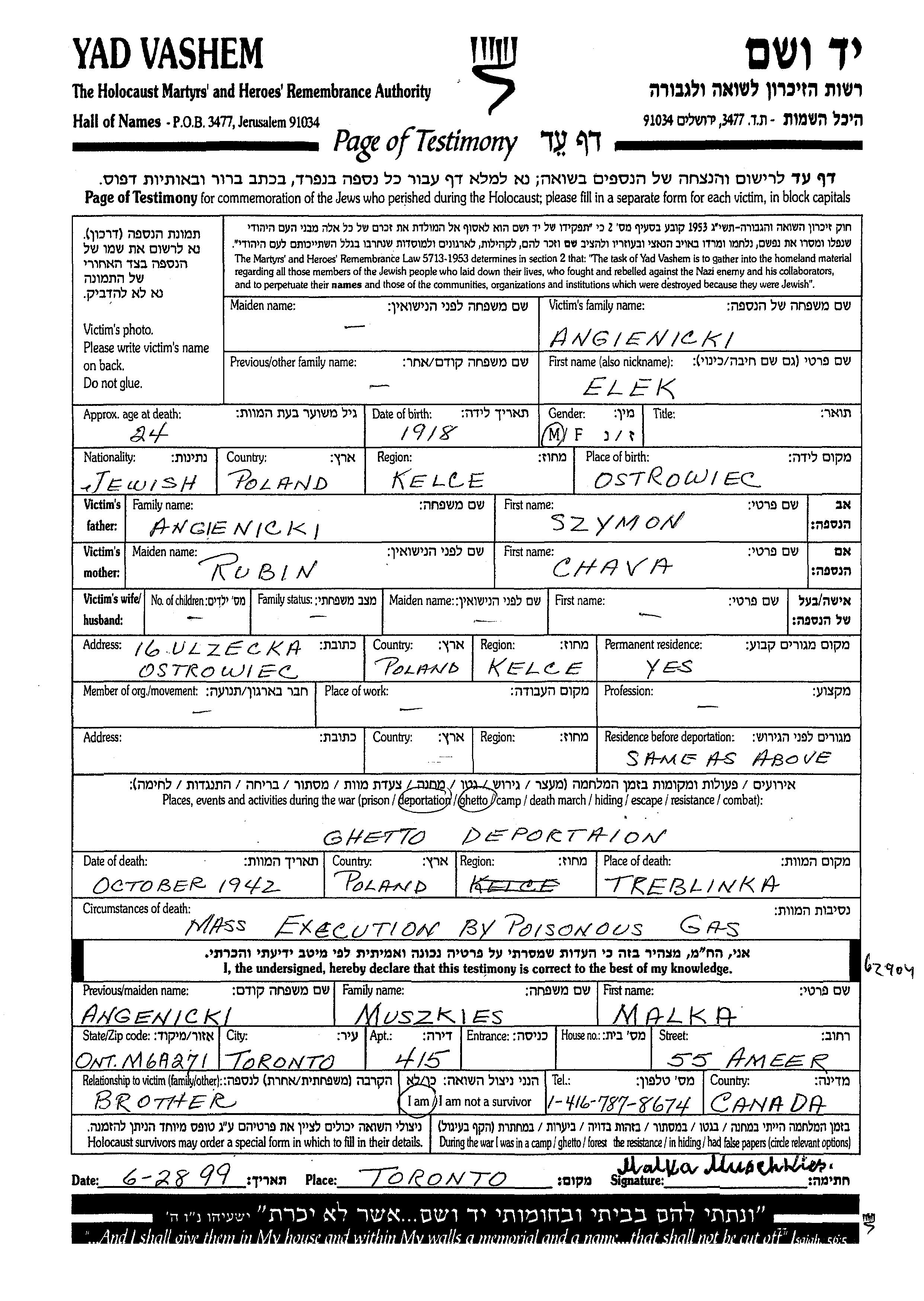 Alek Angienicki wurde im Jahr 1918 in Ostrowiec, Polen geboren. Er war der Sohn von Szymon und Chava. Vor dem Zweiten Weltkrieg lebte er in Ostrowiec, Polen. Während des Krieges war er in Ostrowiec, Polen.