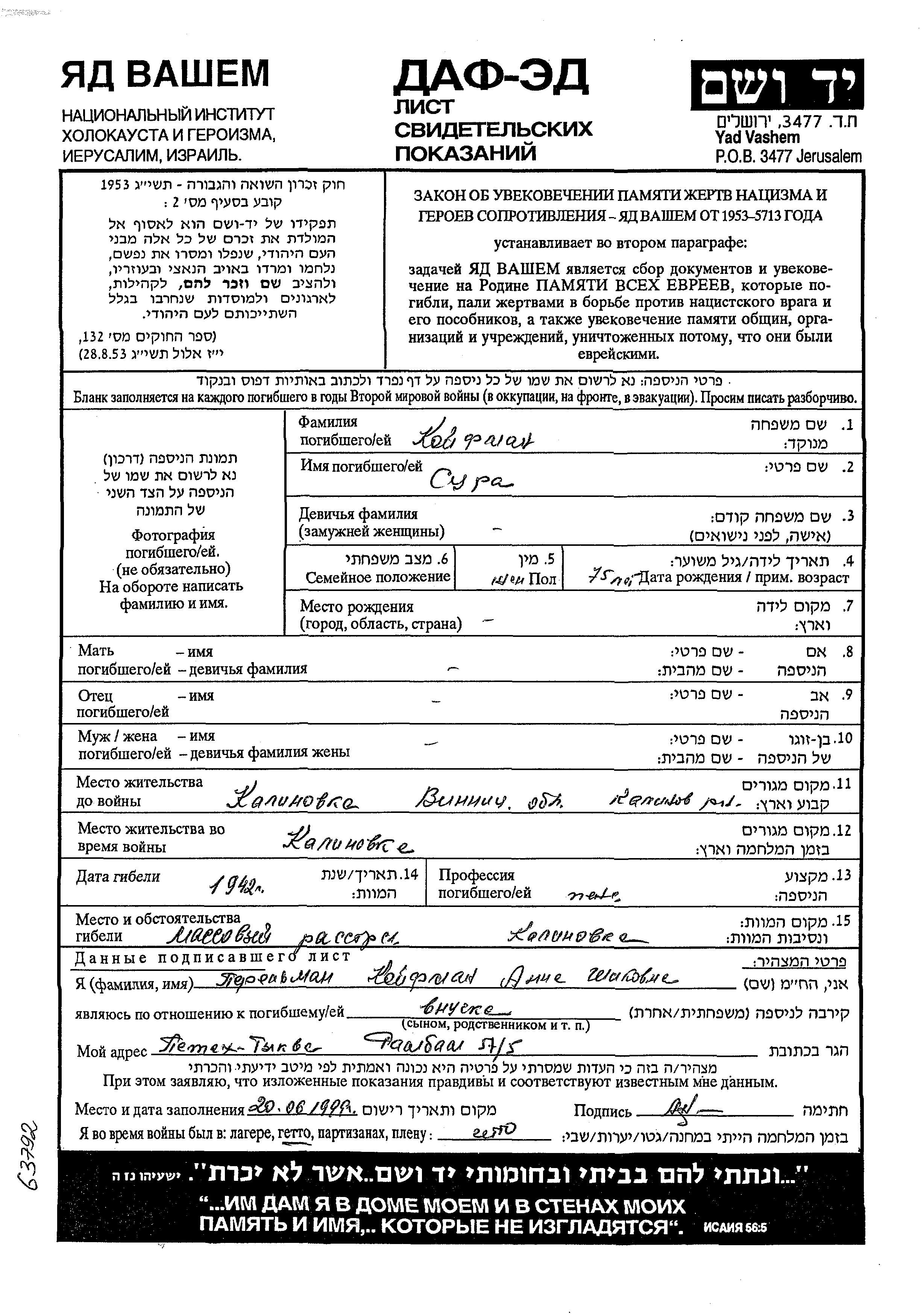 Sura wurde in der Schoah ermordet. Todesort: Kalinovka, Ukraine (UdSSR) im Jahr 1942.