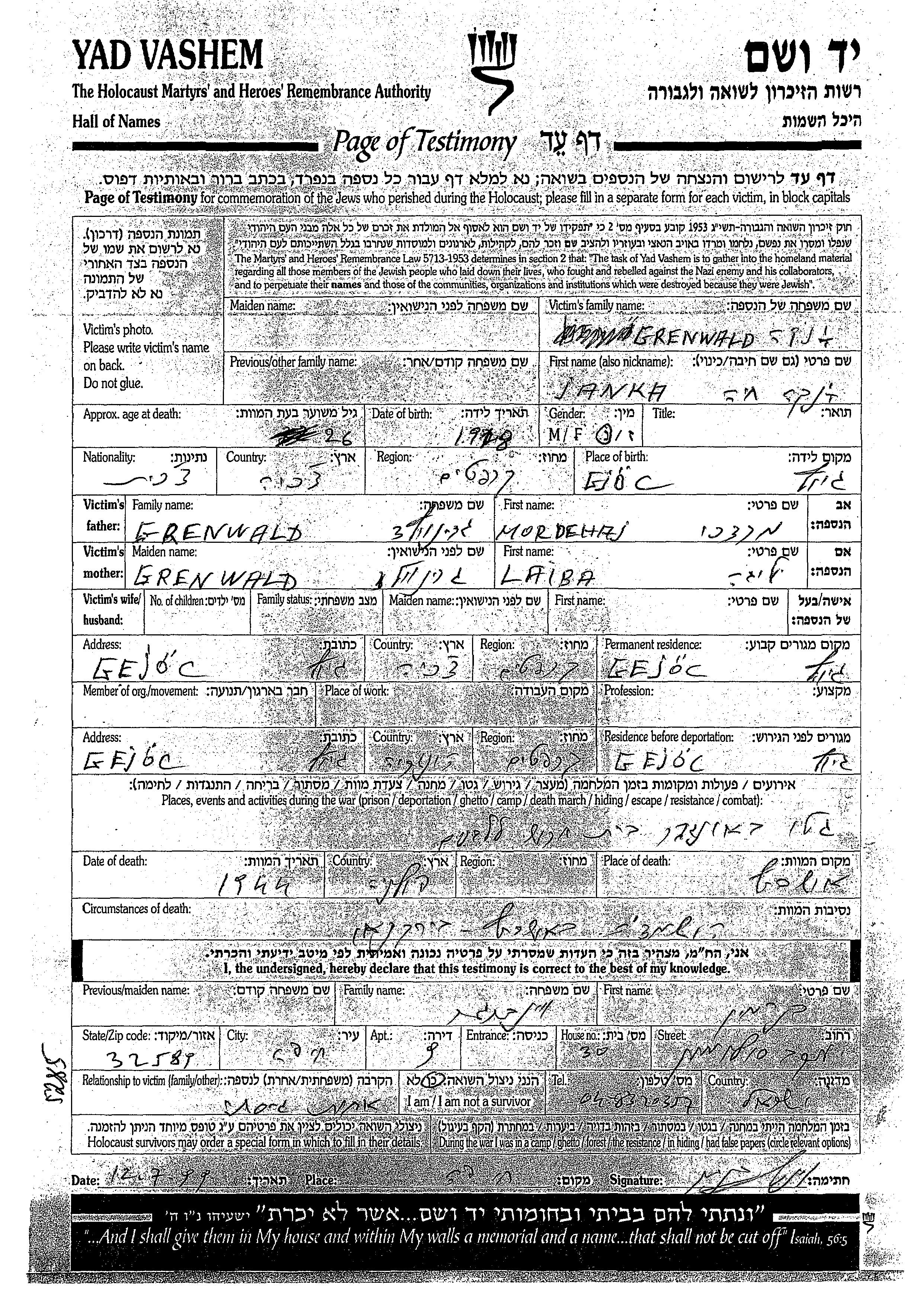 Janka Grenwald wurde im Jahr 1918 in Gejoc, Tschechoslowakei geboren. Sie war die Tochter von Mordehaj und Laiba. Vor dem Zweiten Weltkrieg lebte sie in Gejoc, Tschechoslowakei. Während des Krieges war sie in Gejoc, Tschechoslowakei.