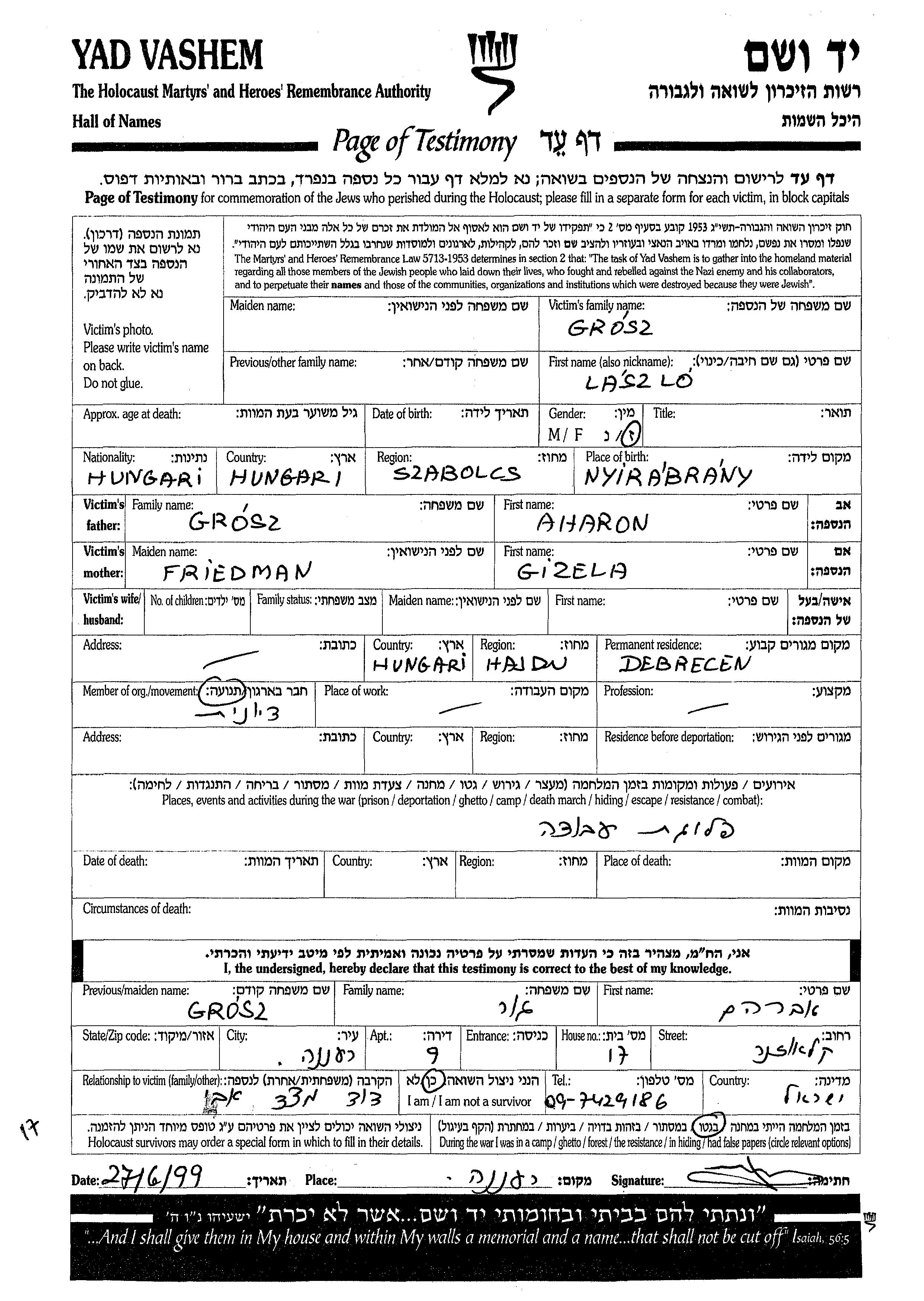 Laszlo Grosz wurde in Nyirabrany, Ungarn geboren. Er war der Sohn von Aharon und Gizela. Vor dem Zweiten Weltkrieg lebte er in Debrecen, Ungarn.