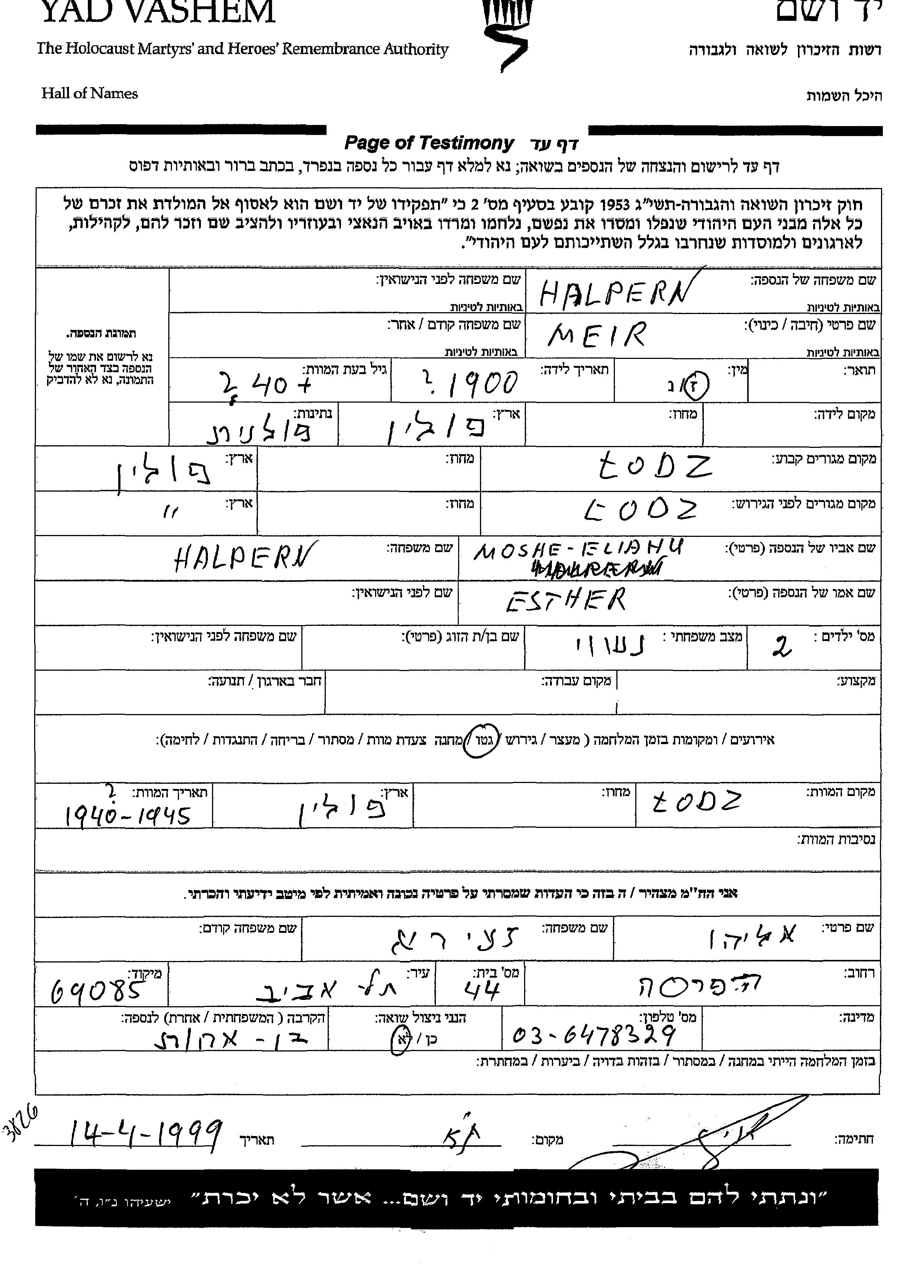 Meir Halpern wurde im Jahr 1900 in Polen geboren. Er war der Sohn von Moshe Eliahu und Esther. Er war Verheiratet. Vor dem Zweiten Weltkrieg lebte er in Lodz, Polen. Während des Krieges war er in Lodz, Polen.