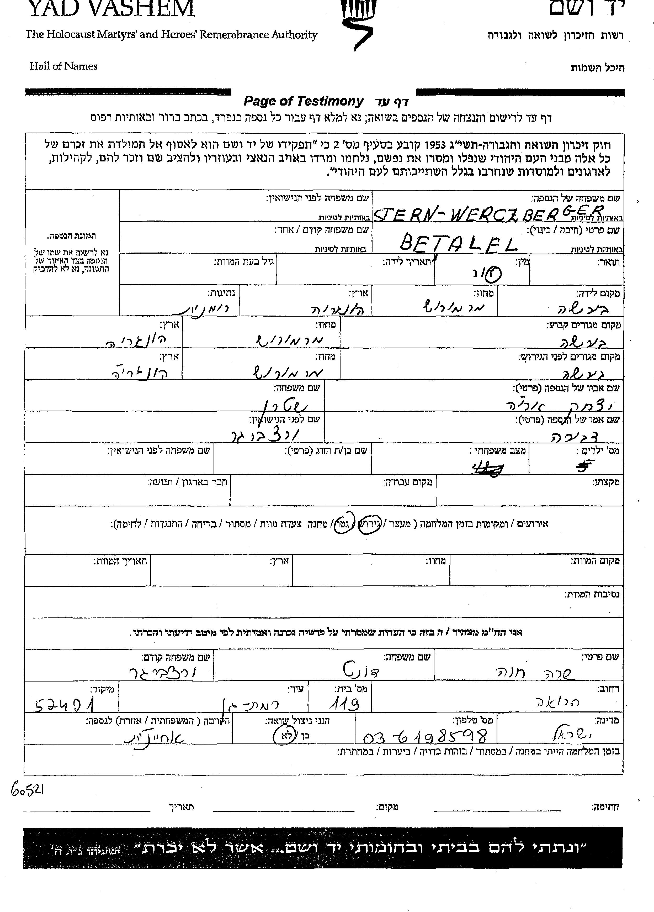 Betalel Stern Werczberger wurde in Borsa, Rumänien geboren. Er war der Sohn von Yitzkhak Arie und Dvora. Vor dem Zweiten Weltkrieg lebte er in Borsa, Rumänien. Während des Krieges war er in Borsa, Rumänien.