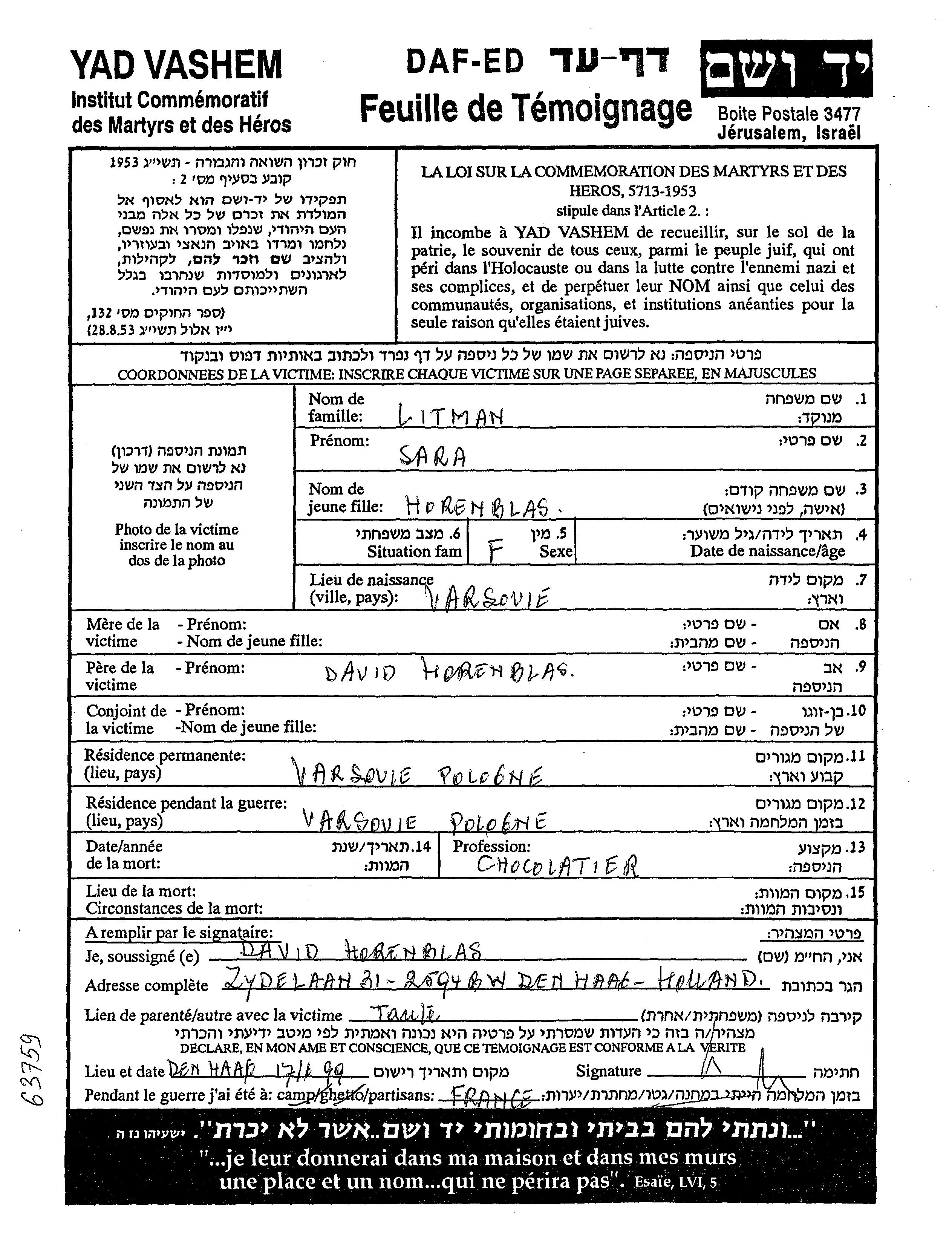 Sara Litman, geb. Horenblas wurde in Warszawa, Polen geboren. Sie war die Tochter von David. Sie war Chocolatier. Vor dem Zweiten Weltkrieg lebte sie in Warszawa, Polen. Während des Krieges war sie in Warszawa, Polen.