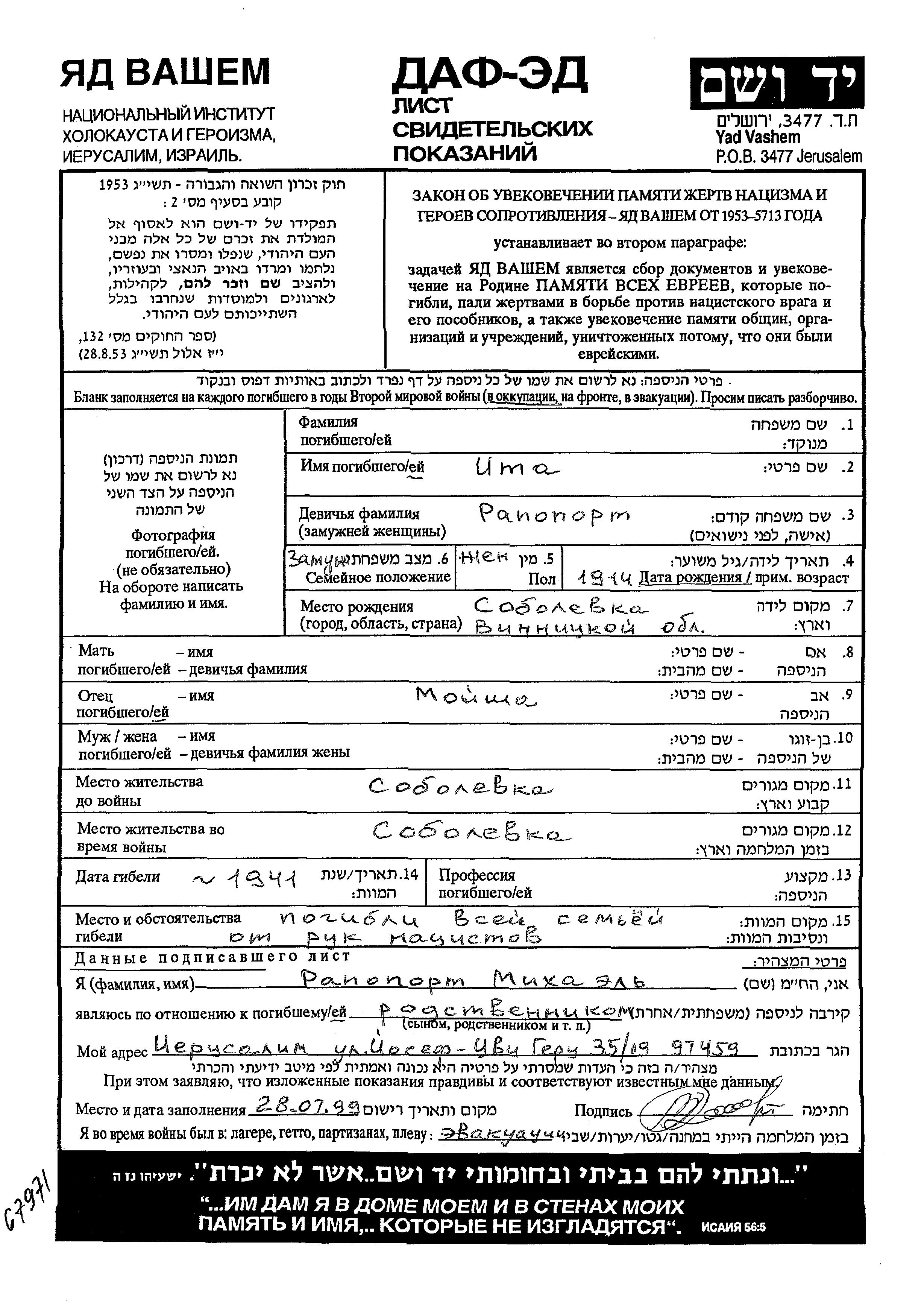 Ita Name unbekannt, geb. Rapoport wurde im Jahr 1914 in Sobolevka, Ukraine (UdSSR) geboren. Sie war die Tochter von Moisha. Sie war Verheiratet. Vor dem Zweiten Weltkrieg lebte sie in Sobolevka, Ukraine (UdSSR). Während des Krieges war sie in Sobolevka, Ukraine (UdSSR).