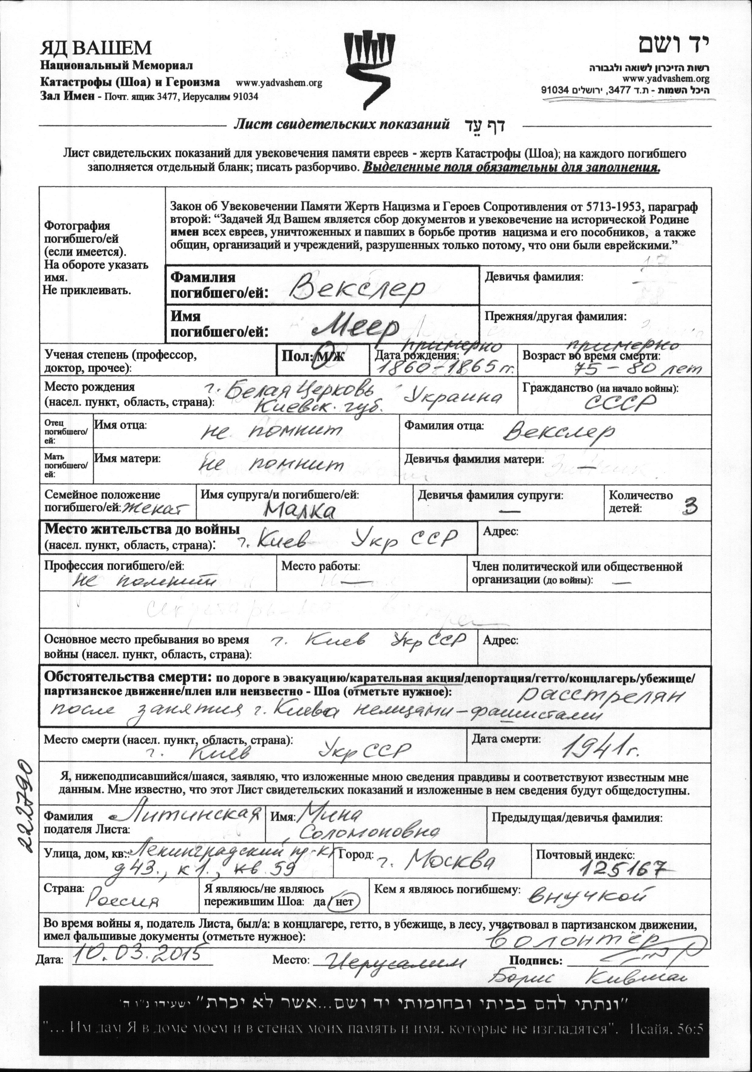 Meer Veksler wurde im Jahr 1860 in Belaya Tserkov, Ukraine (UdSSR) geboren. Er war mit Malka Verheiratet. Vor dem Zweiten Weltkrieg lebte er in Kiev, Ukraine (UdSSR). Während des Krieges war er in Kiev, Ukraine (UdSSR).