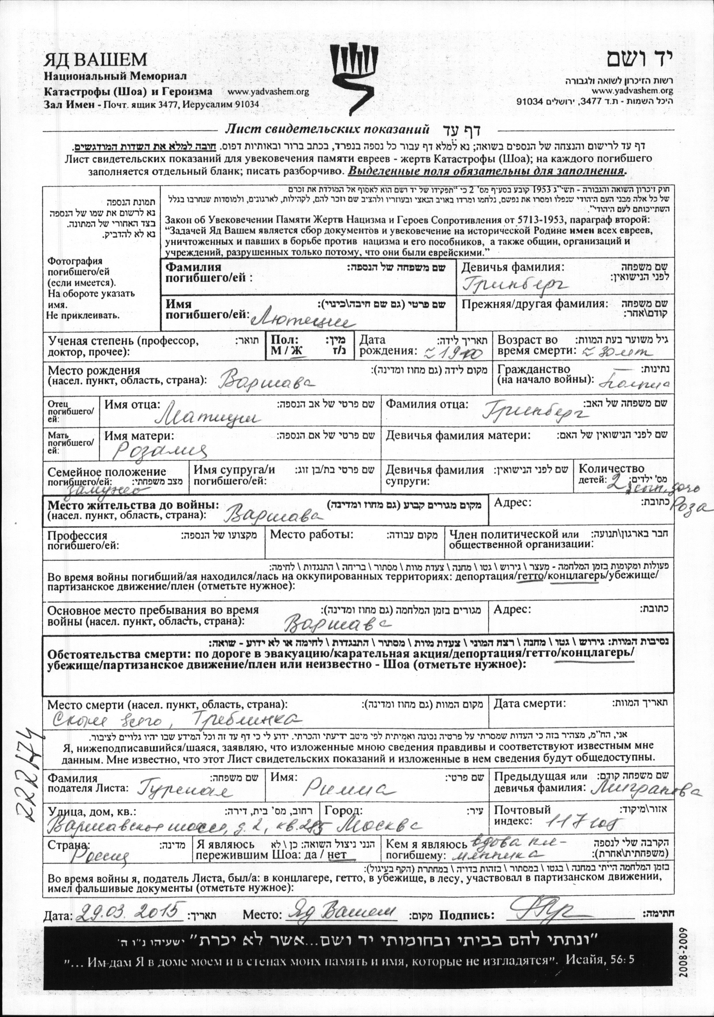 Lyutetziya Name unbekannt, geb. Grinberg wurde im Jahr 1910 in Varshava, Polen geboren. Sie war die Tochter von Matiush und Rozaliya. Sie war Verheiratet. Vor dem Zweiten Weltkrieg lebte sie in Varshava, Polen. Während des Krieges war sie in Warszawa, Polen.