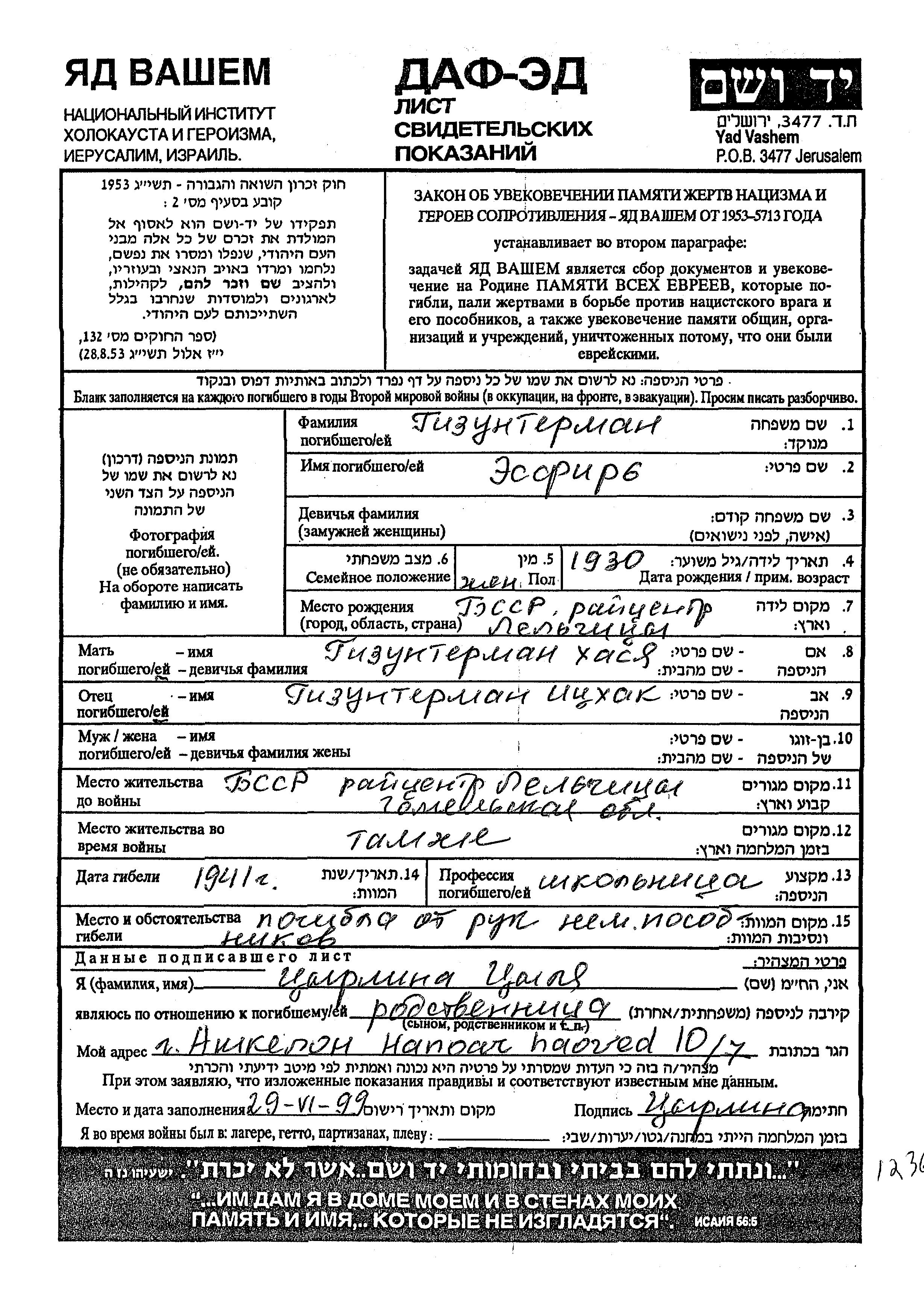 Gizunterman Esfir 1930 Lelchitsy, Weißrussland (UdSSR) Gedenkblatt