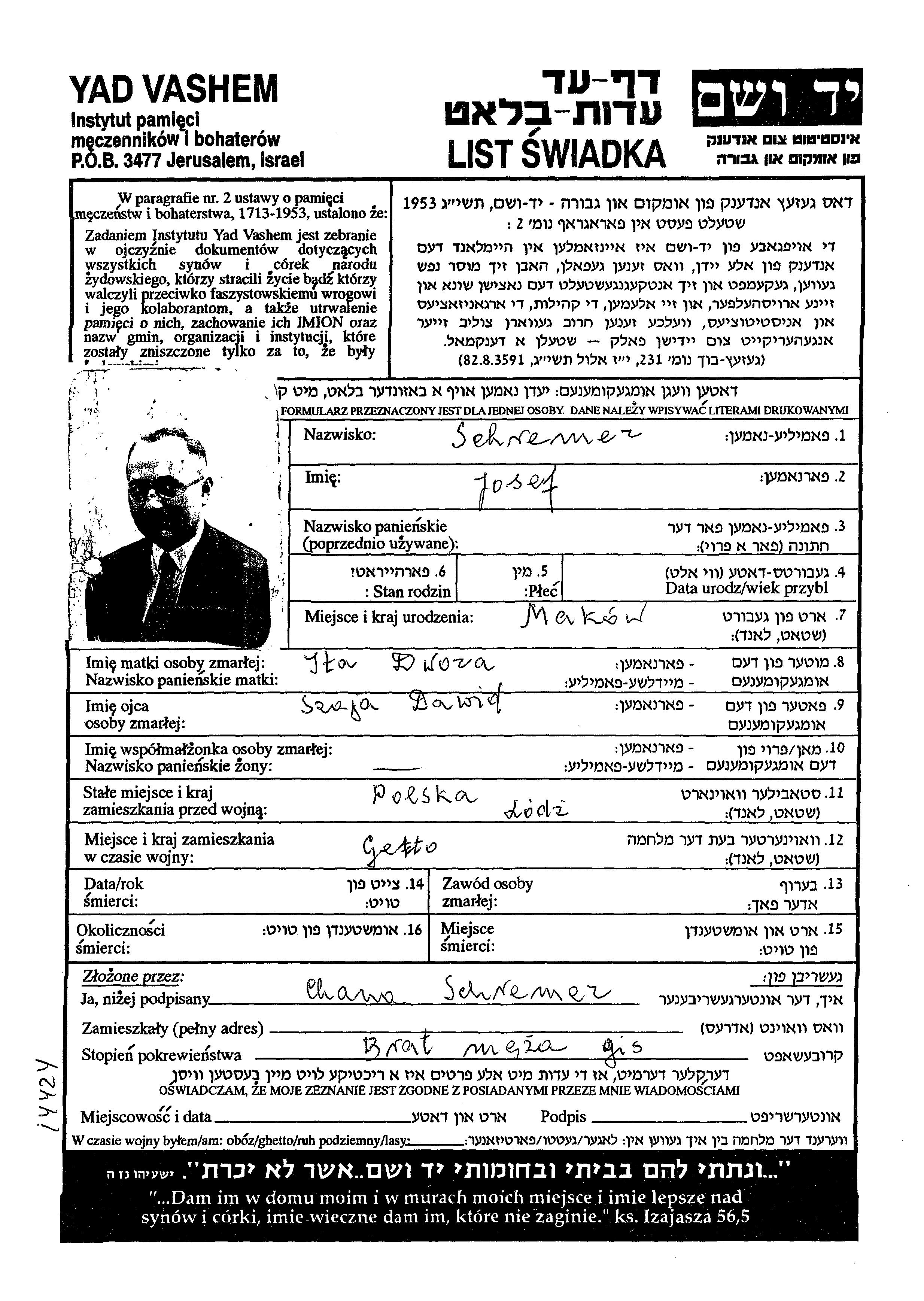 Josef Schremer wurde in Makow, Polen geboren. Er war der Sohn von Szaja Dawid und Ita Dwora. Vor dem Zweiten Weltkrieg lebte er in Lodz, Polen. Während des Krieges war er in Lodz, Polen.