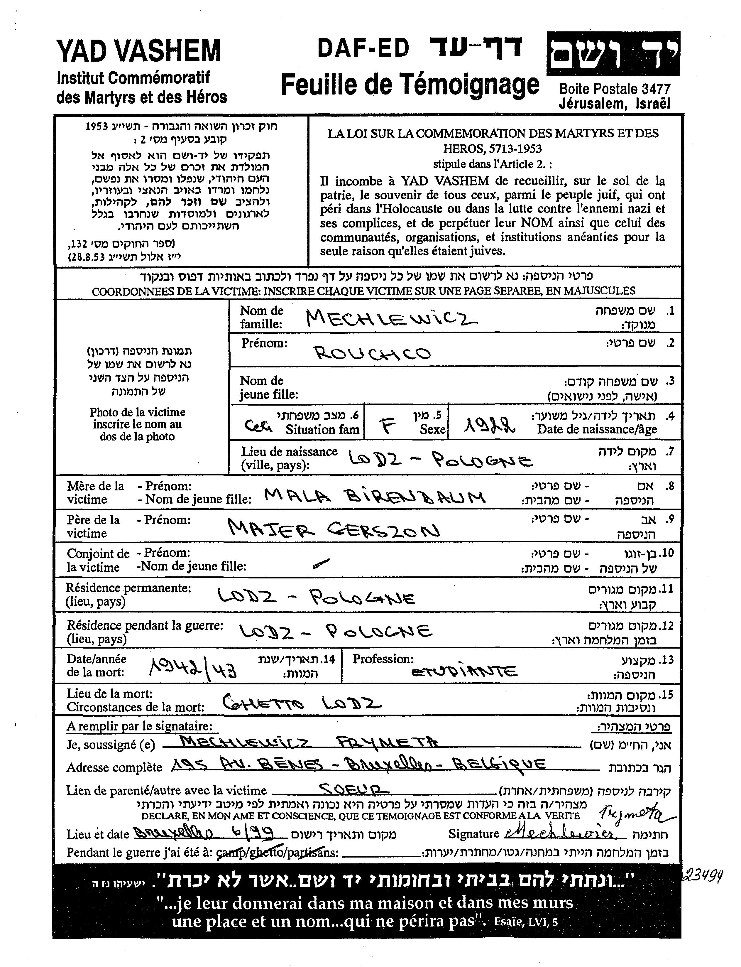 Rouchco Mechlewicz wurde im Jahr 1922 in Lodz, Polen geboren. Sie war die Tochter von Majer Gerszon und Mala. Sie war Student und Ledig. Vor dem Zweiten Weltkrieg lebte sie in Lodz, Polen. Während des Krieges war sie in Lodz, Polen.