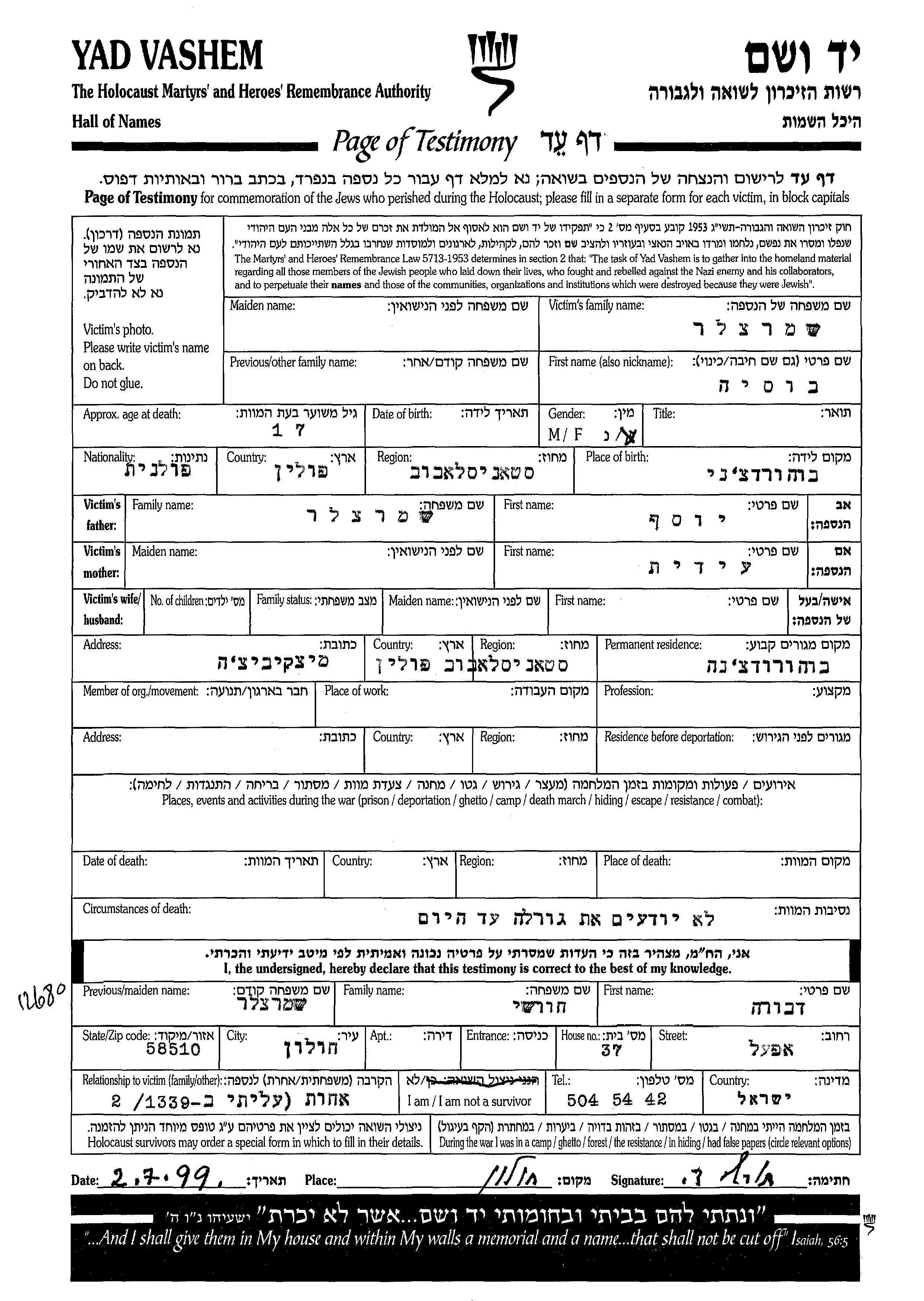 Busia Shmertzler wurde in Bohoroczane, Polen geboren. Sie war die Tochter von Yosef und Idit. Sie war Ledig. Vor dem Zweiten Weltkrieg lebte sie in Bohoroczane, Polen. Während des Krieges war sie in Bohoroczane, Polen.