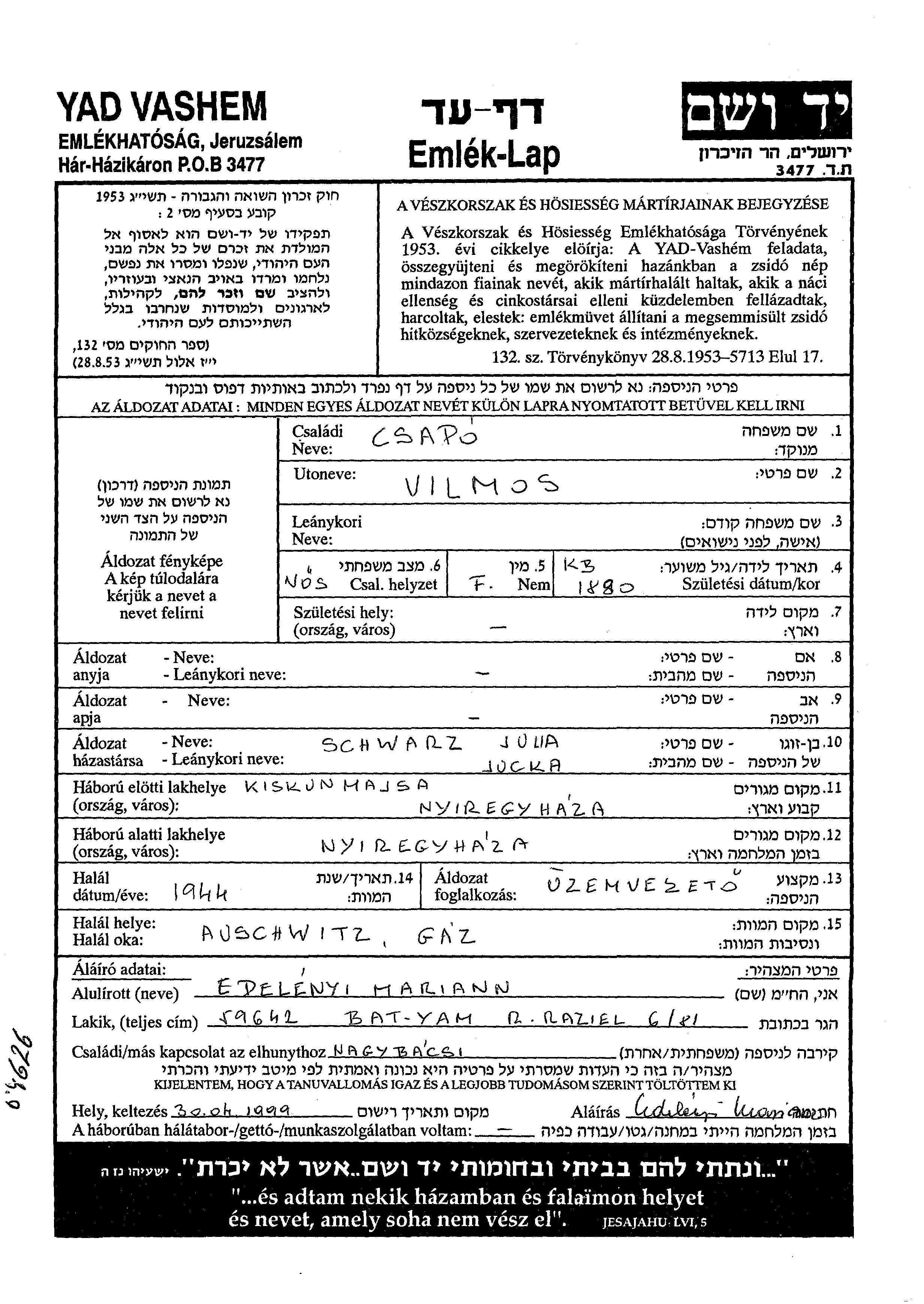 Vilmosh Csapo wurde im Jahr 1880 geboren. Er war Uzemigazgato und mit Julia, geb. Schwarz Verheiratet. Vor dem Zweiten Weltkrieg lebte er in Nyiregyhaza, Ungarn. Während des Krieges war er in Nyiregyhaza, Ungarn.