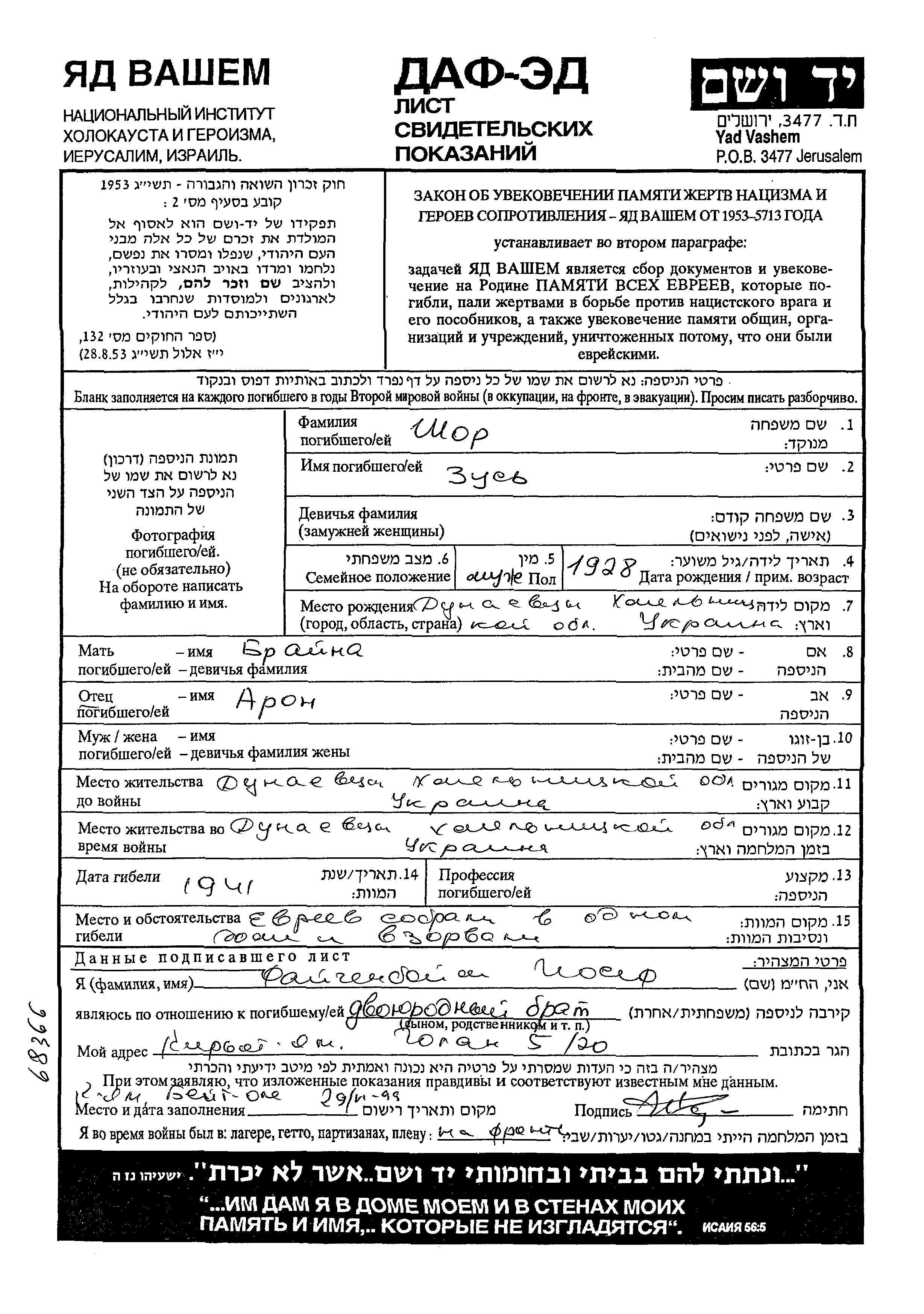 Zus Shor wurde im Jahr 1928 in Dunayevtsy, Ukraine (UdSSR) geboren. Er war der Sohn von Aron und Braina. Er war Kind. Vor dem Zweiten Weltkrieg lebte er in Dunayevtsy, Ukraine (UdSSR). Während des Krieges war er in Dunayevtsy, Ukraine (UdSSR).