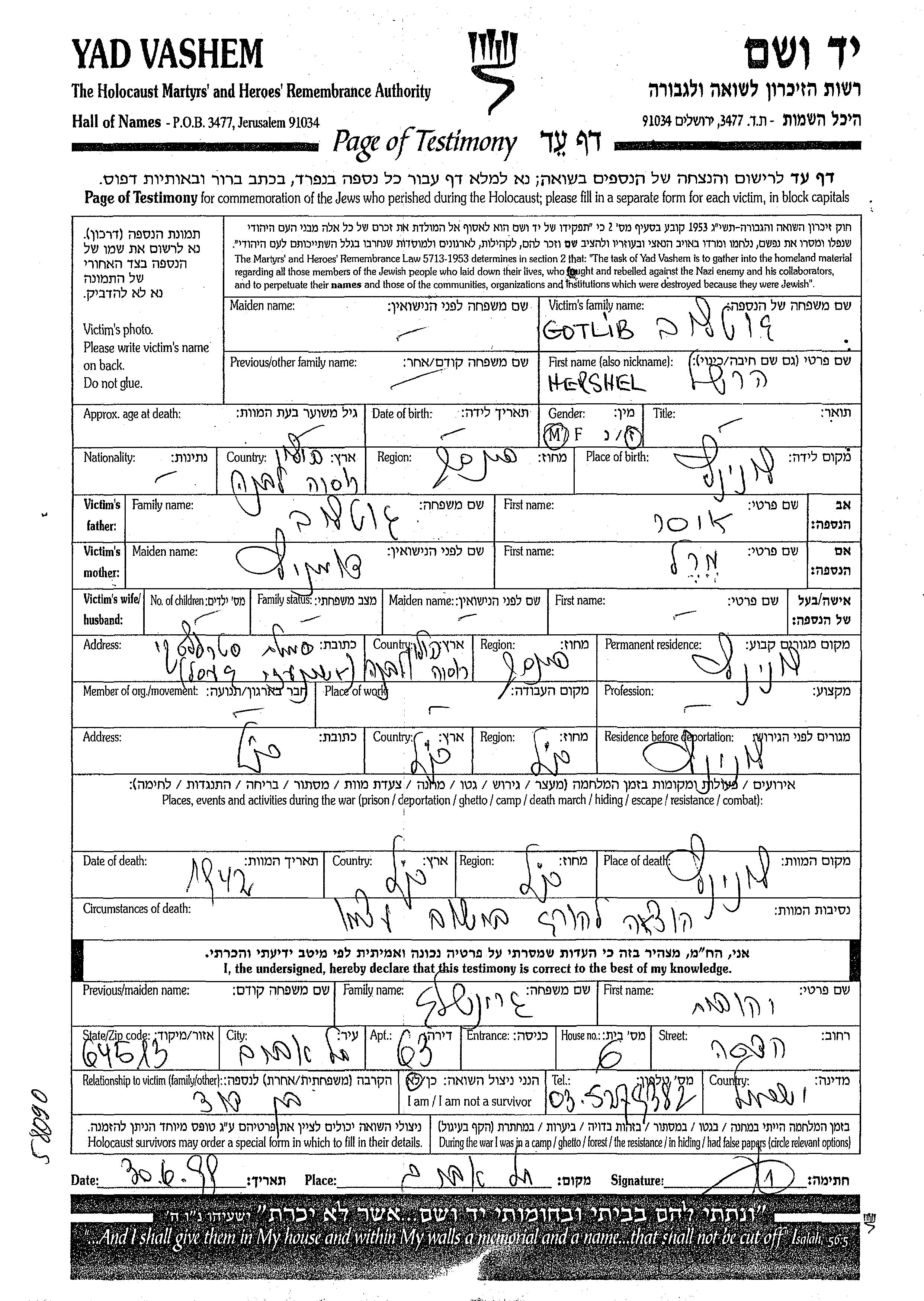 Hershel Gotlib wurde in Luniniec, Polen geboren. Er war der Sohn von Isser und Miriam. Vor dem Zweiten Weltkrieg lebte er in Luniniec, Polen. Während des Krieges war er in Luniniec, Polen.