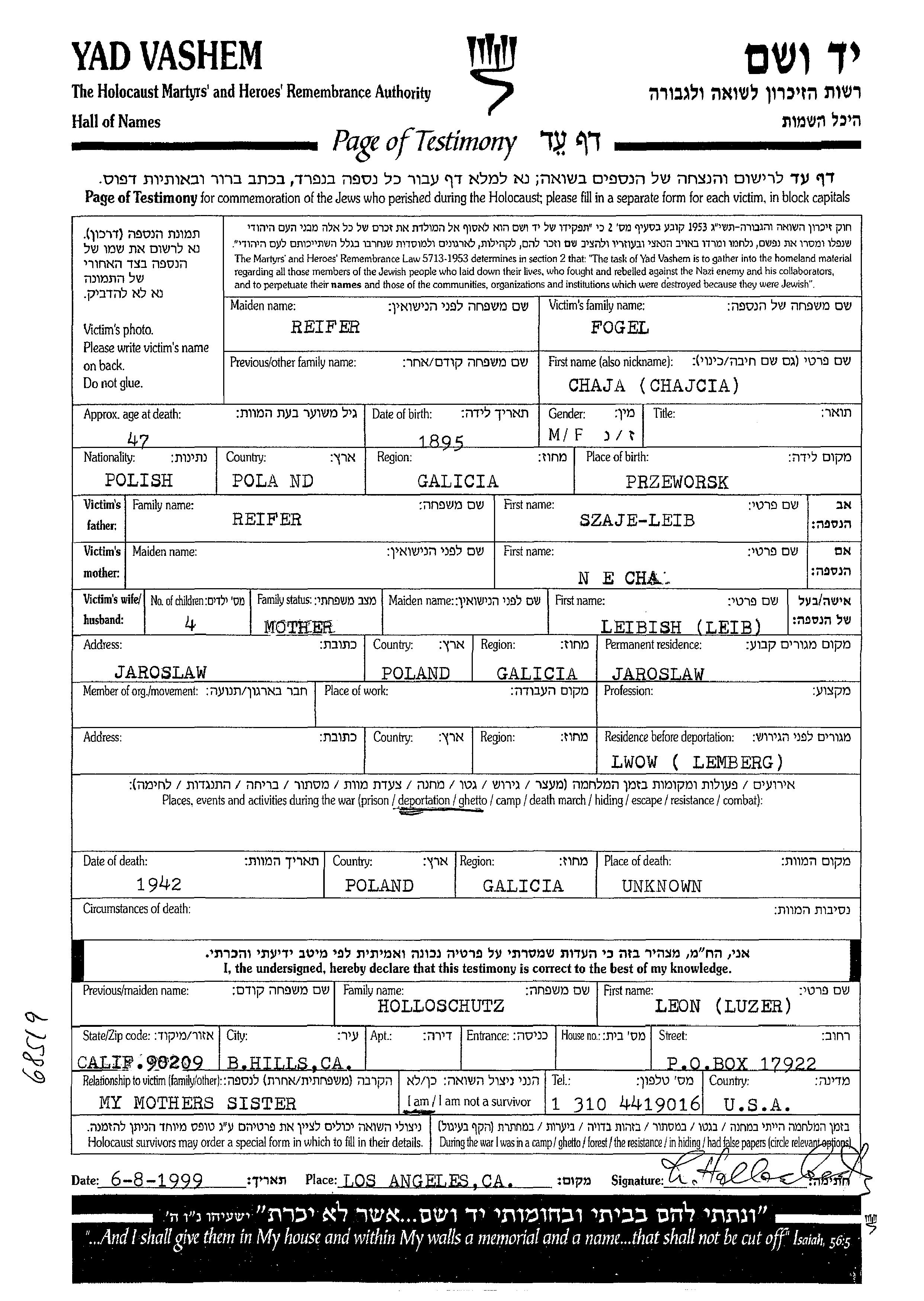 Chaja Fogel, geb. Reifer wurde im Jahr 1895 in Przeworsk, Polen geboren. Sie war die Tochter von Szaje und Necha. Sie war mit Leibish Verheiratet. Vor dem Zweiten Weltkrieg lebte sie in Jaroslau, Polen. Während des Krieges war sie in Lwow, Polen.