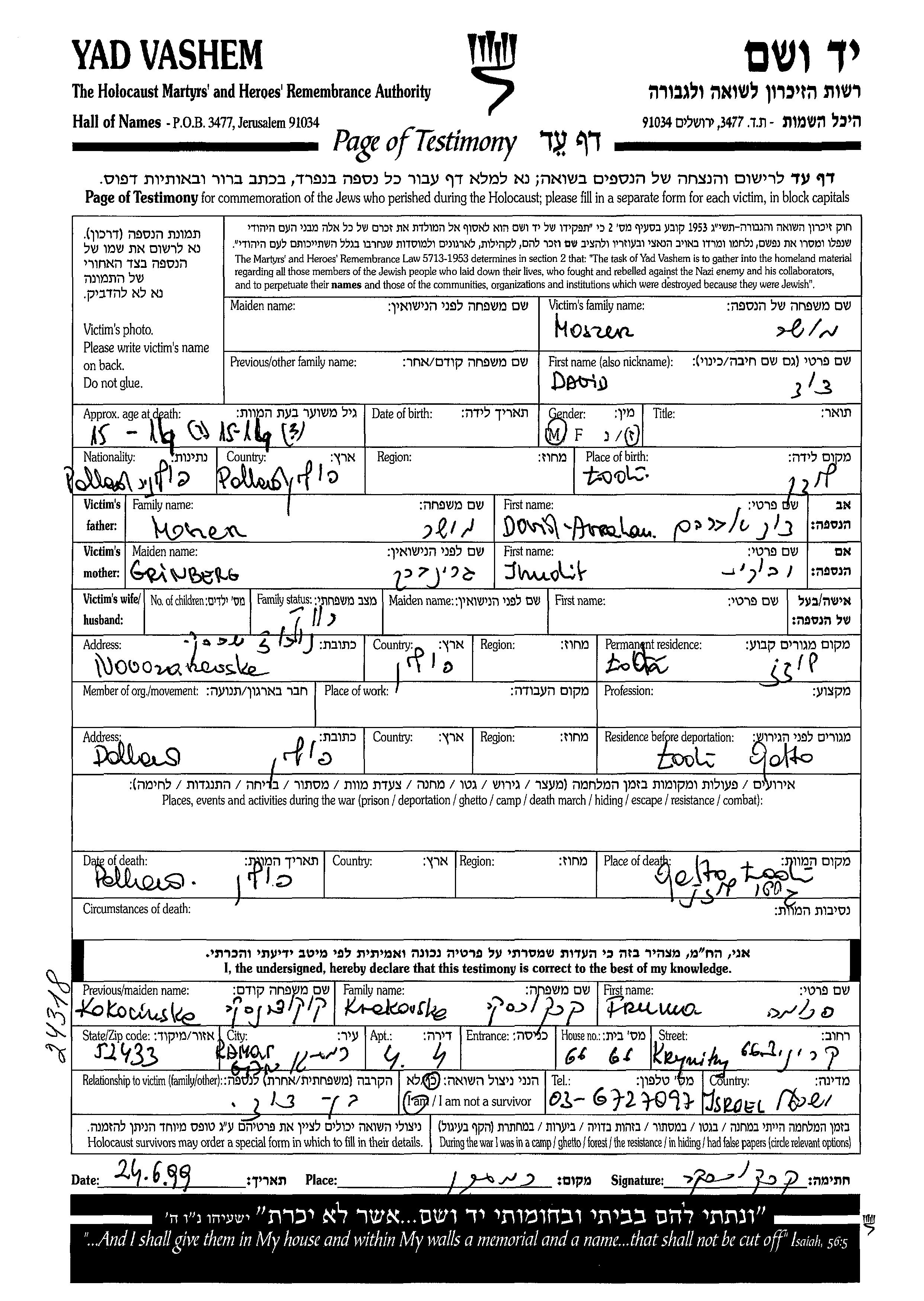 David Moszer wurde in Lodz, Polen geboren. Er war der Sohn von David Avraham und Jhudit. Er war Kind. Vor dem Zweiten Weltkrieg lebte er in Lodz, Polen. Während des Krieges war er in Lodz, Polen.