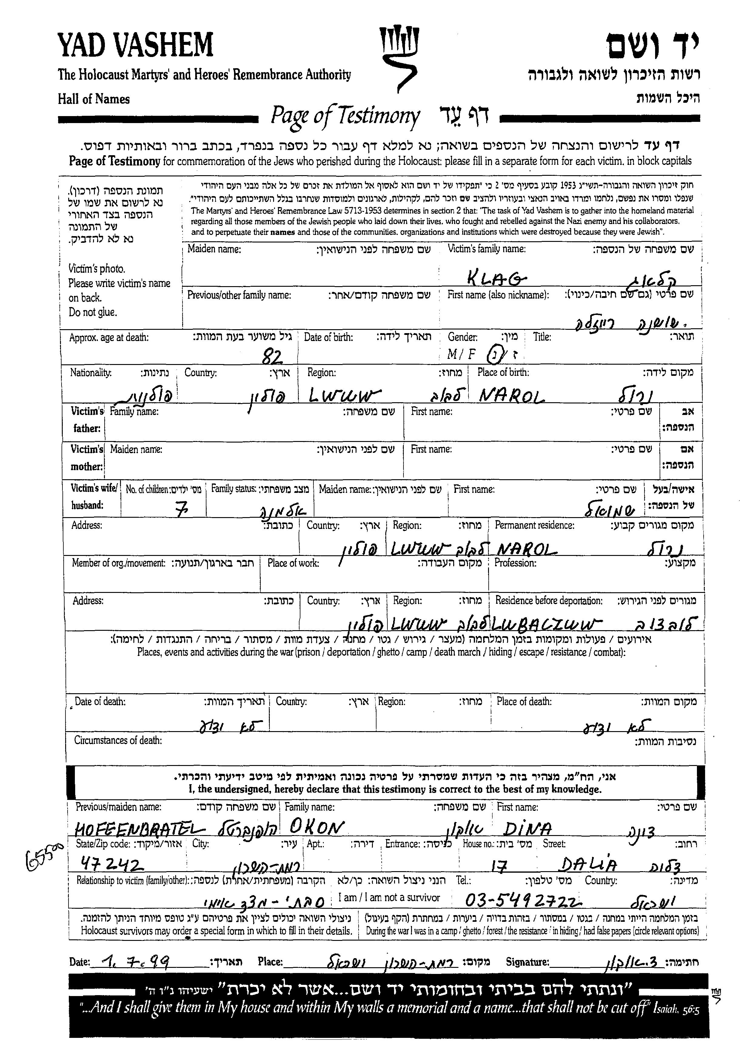 Shoshana Klag wurde in Narol, Polen geboren. Sie war mit Shmuel Witwe. Vor dem Zweiten Weltkrieg lebte sie in Narol, Polen. Während des Krieges war sie in Lubaczow, Polen.