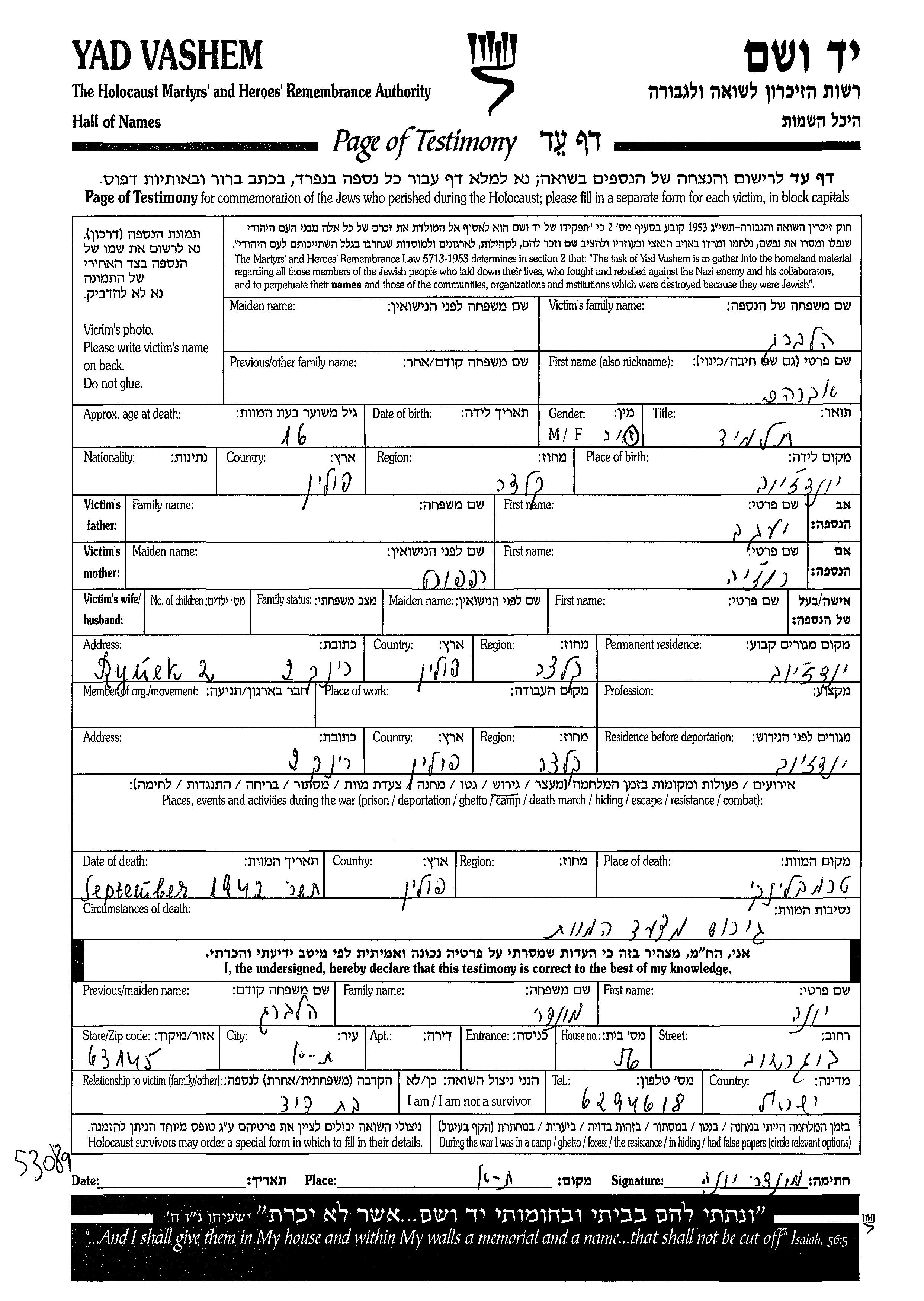 Avraham wurde in der Schoah ermordet. Todesort: Treblinka, Polen im Jahr 09/1942.