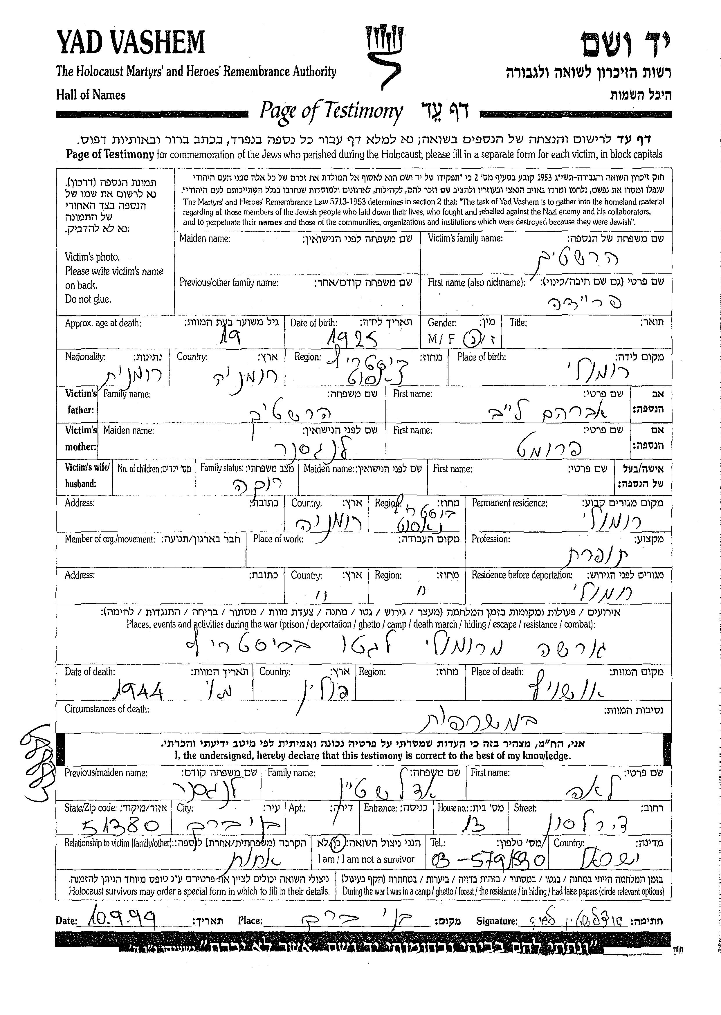 Freida Hershtik wurde im Jahr 1925 in Romoli, Rumänien geboren. Sie war die Tochter von Avraham Leib und Frumet. Sie war Schneiderin und Ledig. Vor dem Zweiten Weltkrieg lebte sie in Romoli, Rumänien. Während des Krieges war sie in Romoli, Rumänien.