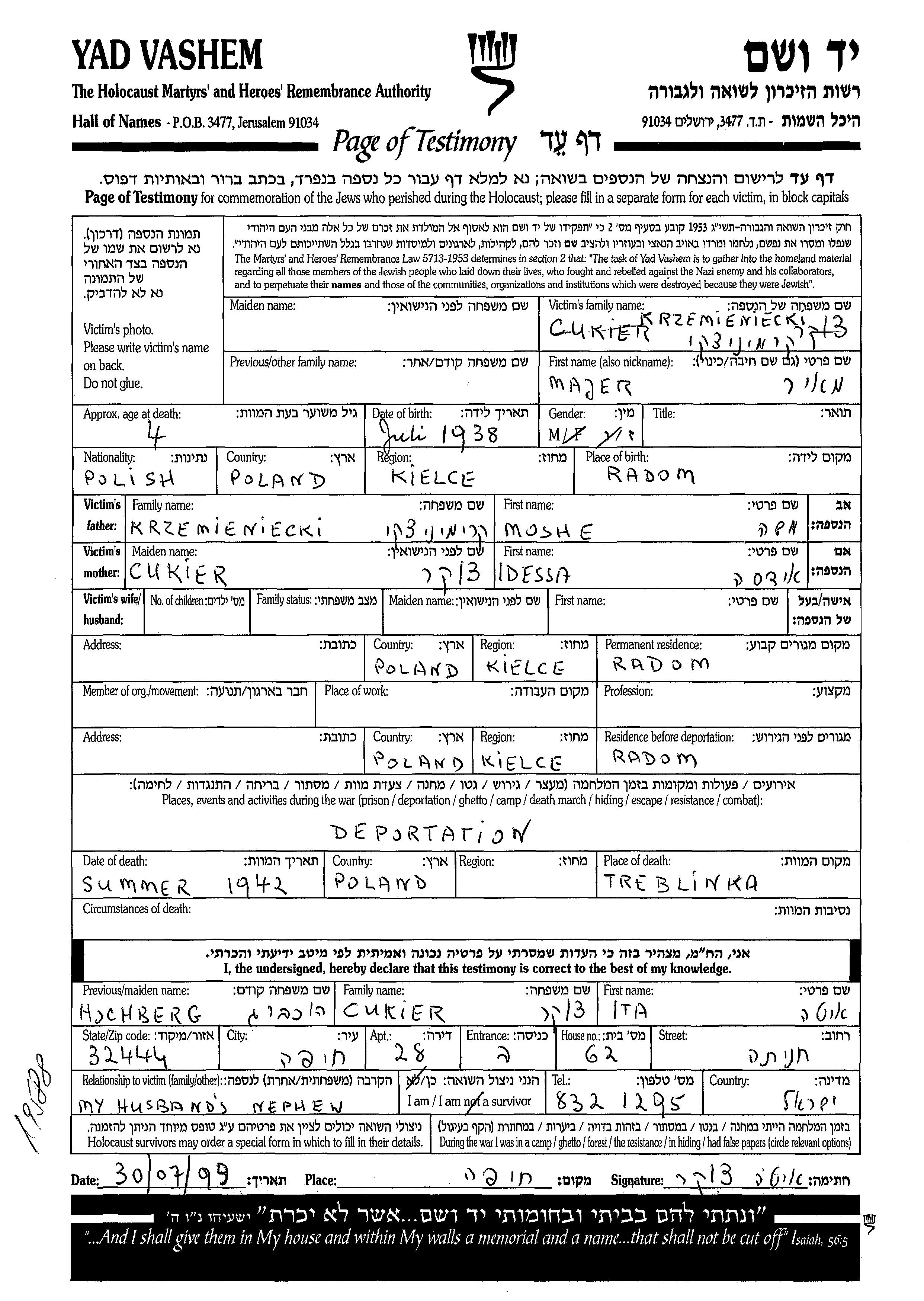 Majer Krzemieniecki Kremenetzki wurde im Jahr 1938 in Radom, Polen geboren. Er war der Sohn von Moshe und Idessa. Vor dem Zweiten Weltkrieg lebte er in Radom, Polen. Während des Krieges war er in Radom, Polen.