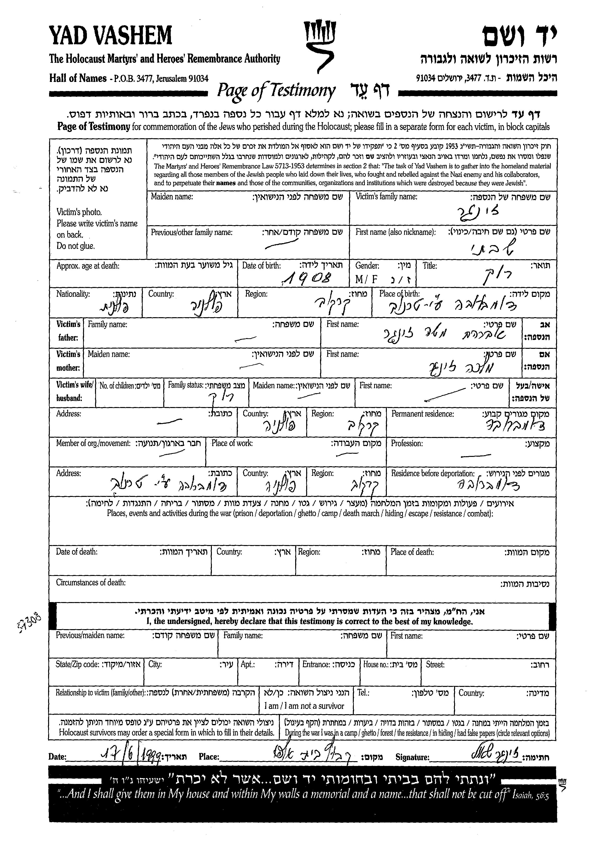 Zinger Shabtai 1908 Dabrowa Tarnowska, Polen Gedenkblatt