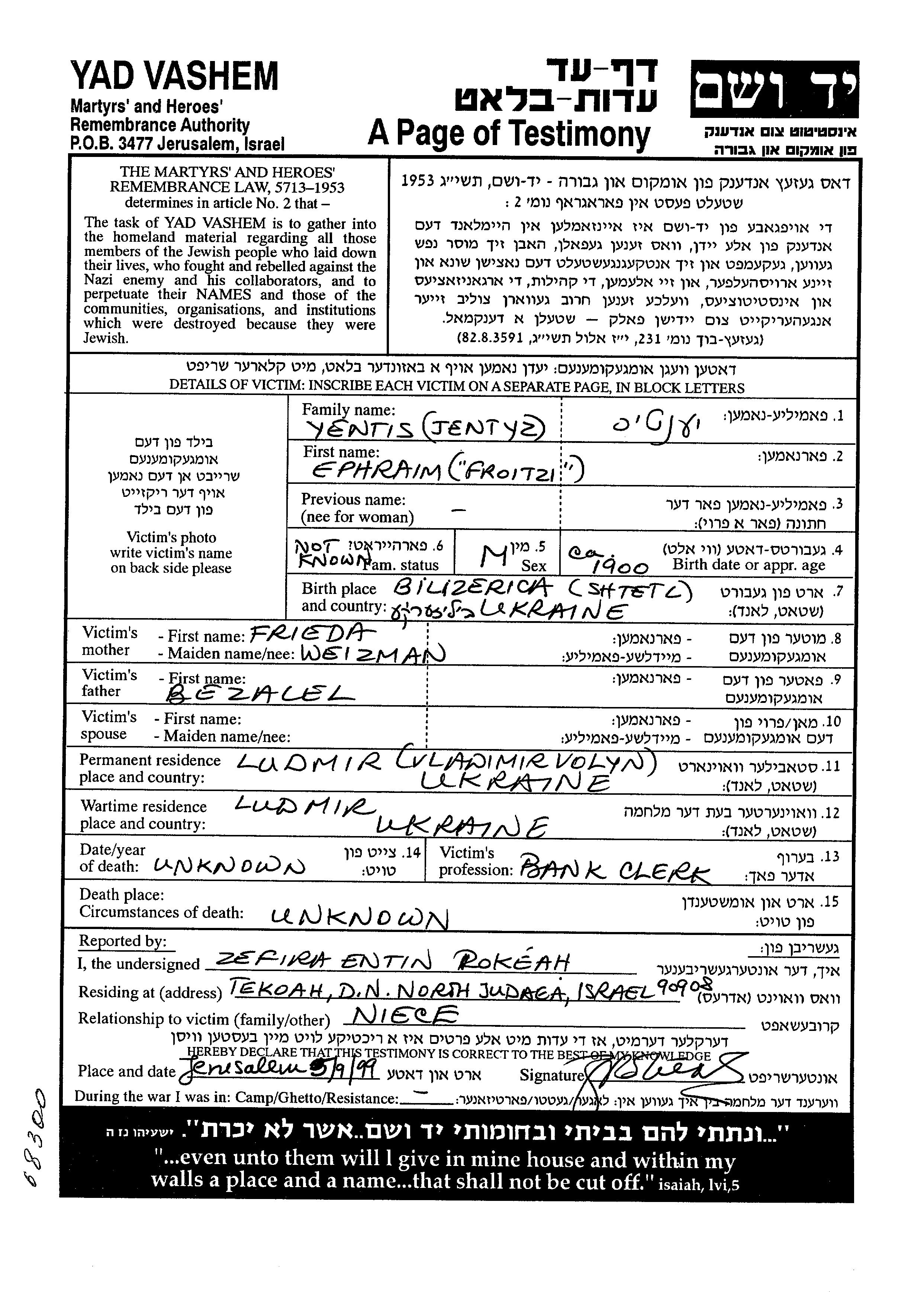Ephraim Yentis wurde im Jahr 1900 in Bilizerka, Polen geboren. Er war der Sohn von Bezalel und Frieda. Er war Bankangestellte/-r. Vor dem Zweiten Weltkrieg lebte er in Ludmir, Polen. Während des Krieges war er in Ludmir, Polen.
