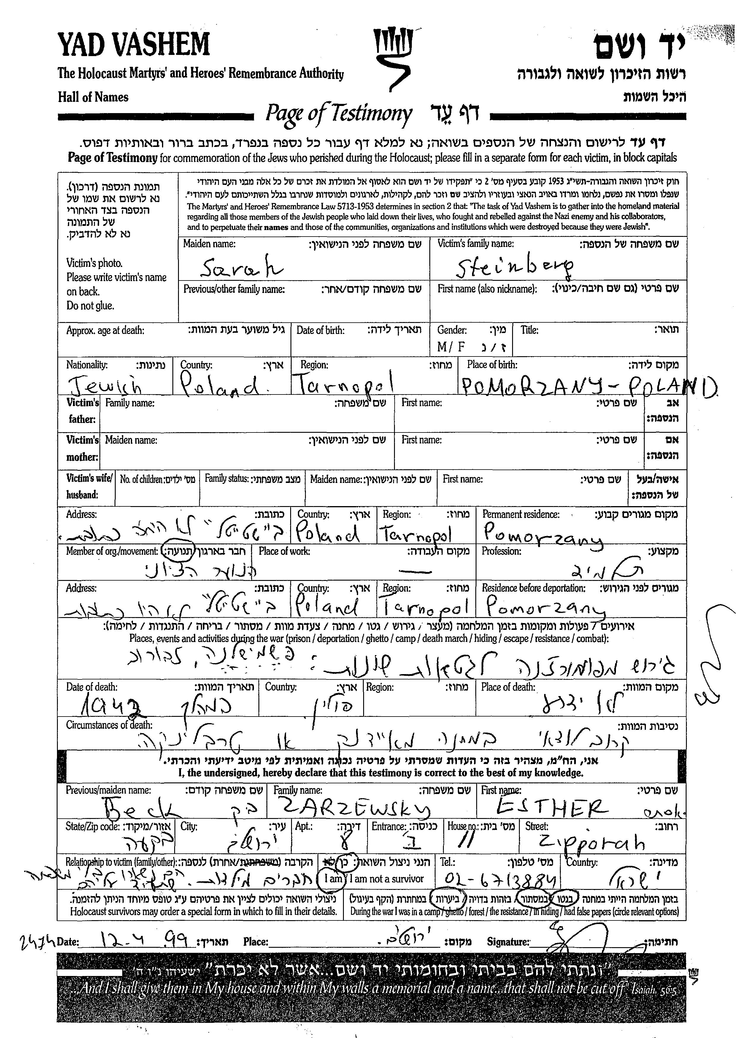 Sarah Steinberg wurde in Pomorzany, Polen geboren. Sie war Schüler/-in und Kind. Vor dem Zweiten Weltkrieg lebte sie in Pomorzany, Polen. Während des Krieges war sie in Pomorzany, Polen.