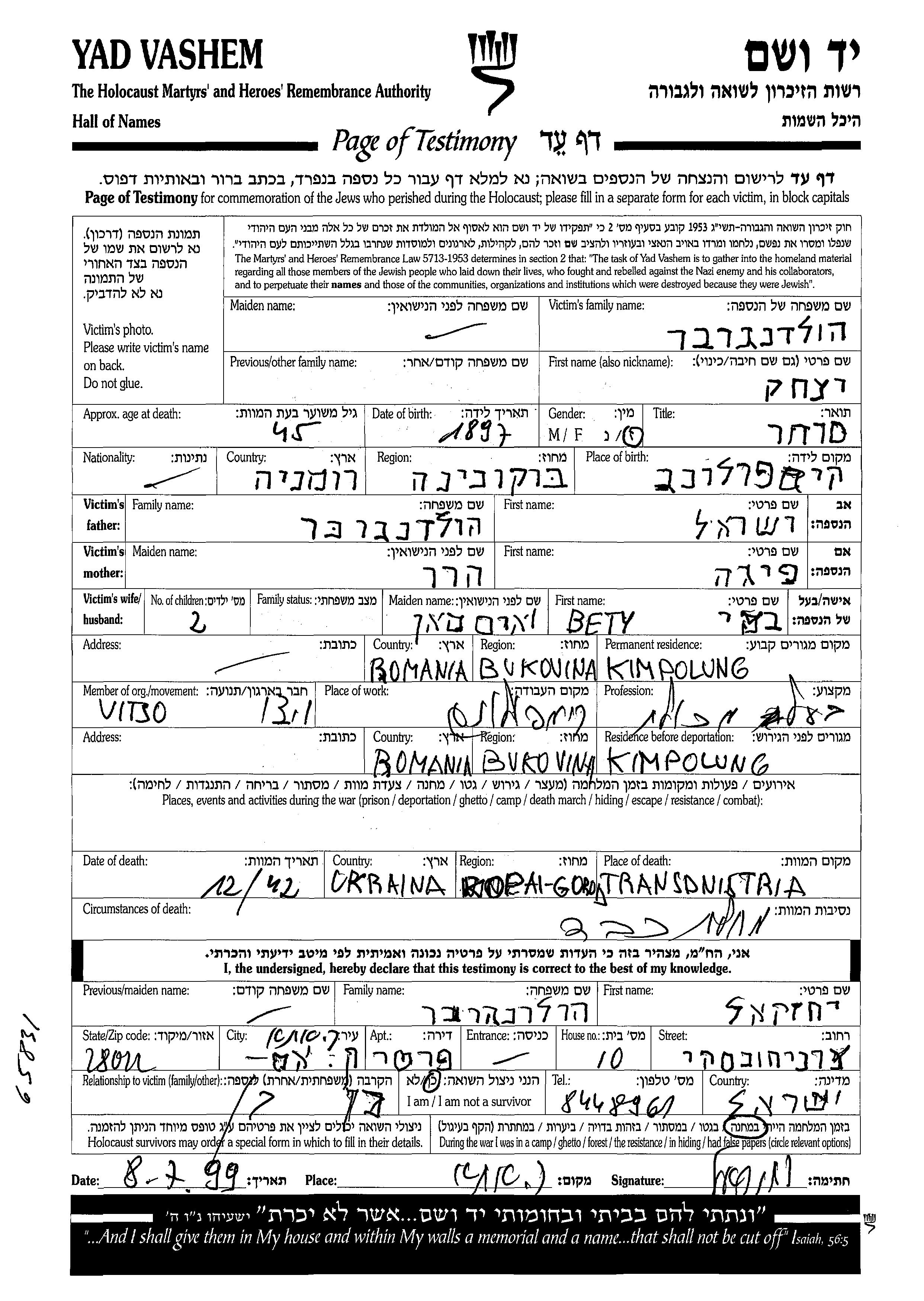 Yitzkhak Holdengraber wurde im Jahr 1897 in Kimpolung, Rumänien geboren. Er war der Sohn von Yisrael und Feiga. Er war Besitzer/-in eines lebensmittelgeschäfts und mit Bety, geb. Veisman Verheiratet. Vor dem Zweiten Weltkrieg lebte er in Kimpolung, Rumänien. Während des Krieges war er in Kimpolung, Rumänien.