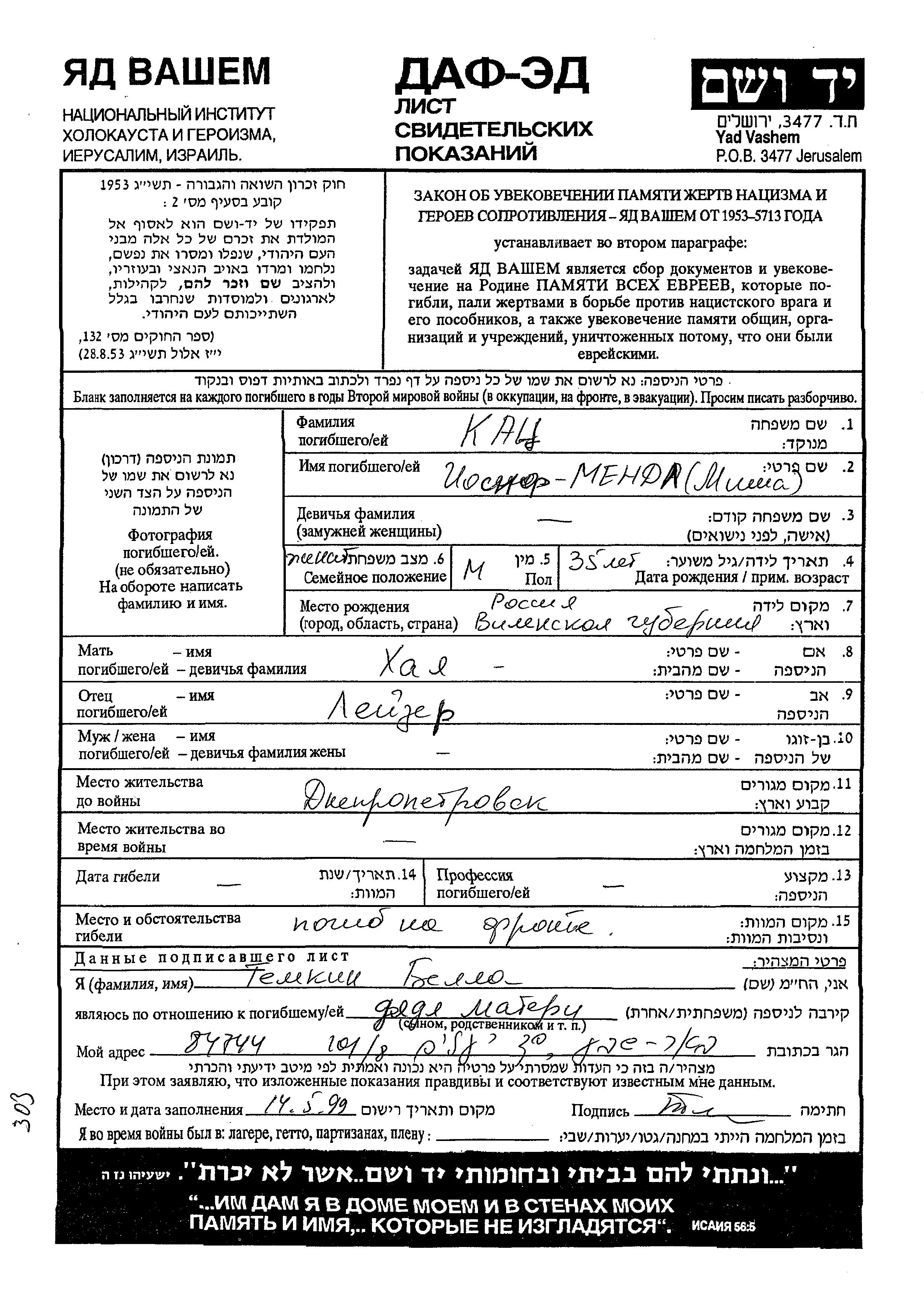 Iosif Mendl Misha Katz wurde in Wilno, Polen geboren. Er war der Sohn von Leizer und Khaia. Er war Verheiratet. Vor dem Zweiten Weltkrieg lebte er in Dnepropetrovsk, Ukraine (UdSSR). Iosif Mendl Misha im Militärdienst umgekommen. Todesort: die Sowjetischen Streitkräfte.