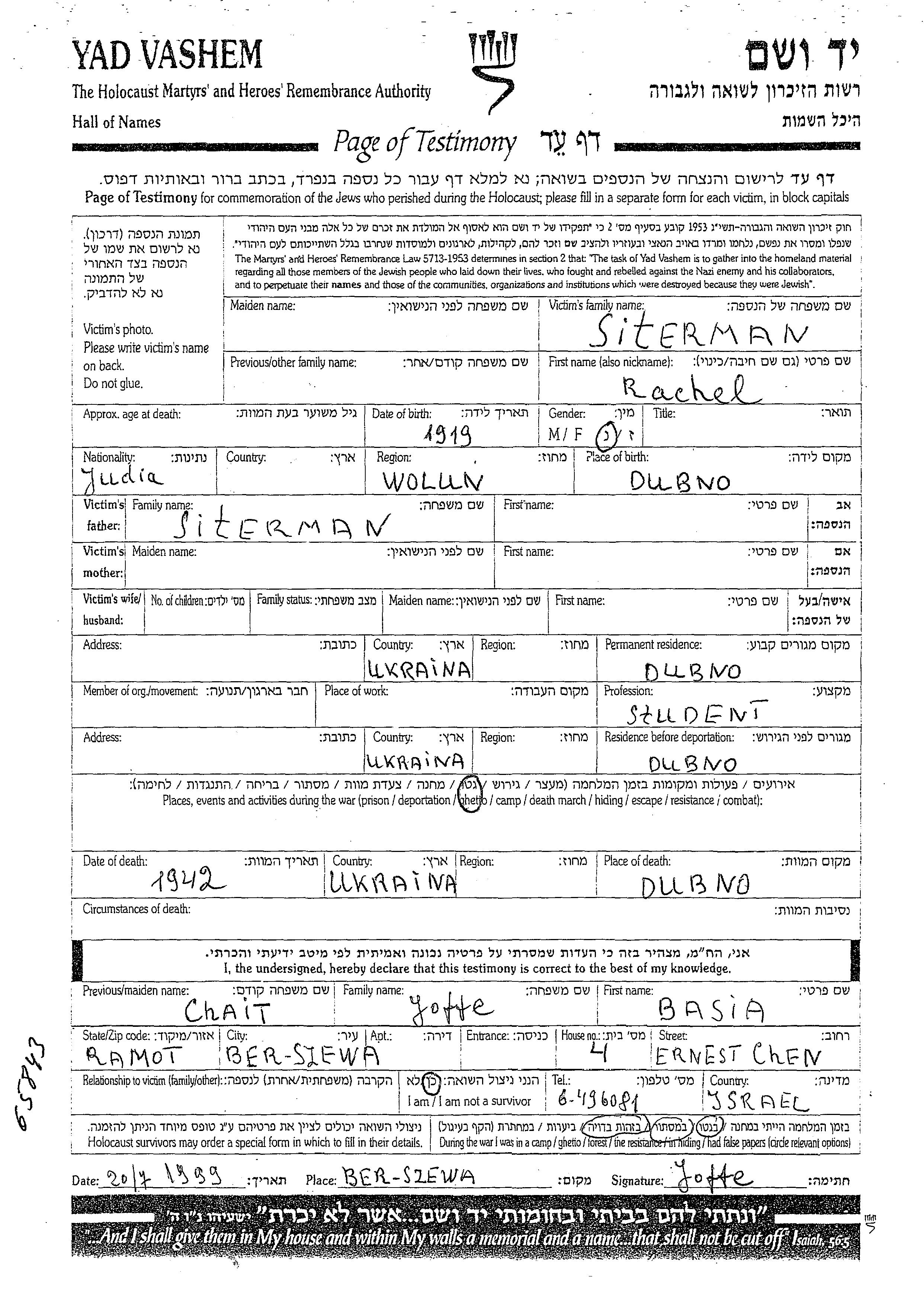 Siterman Rachel 1919 Dubno, Polen Gedenkblatt