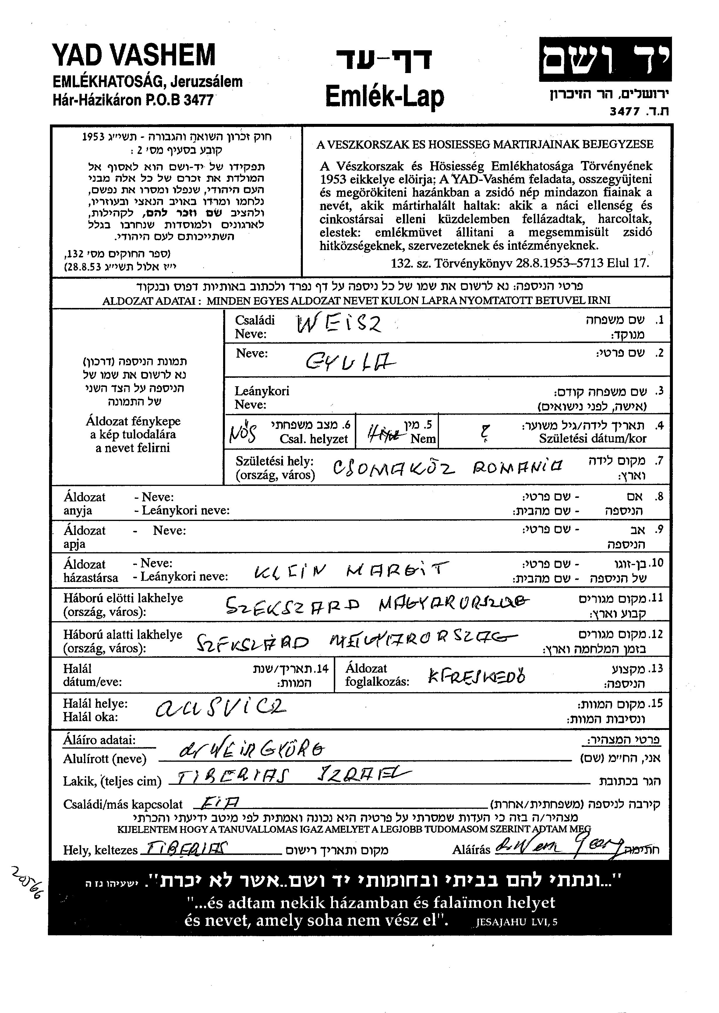 Gyula Weisz wurde in Csomakoz, Rumänien geboren. Er war Kaufmann/-frau und mit Margit, geb. Klein Verheiratet. Vor dem Zweiten Weltkrieg lebte er in Szekszard, Ungarn. Während des Krieges war er in Szekszard, Ungarn.