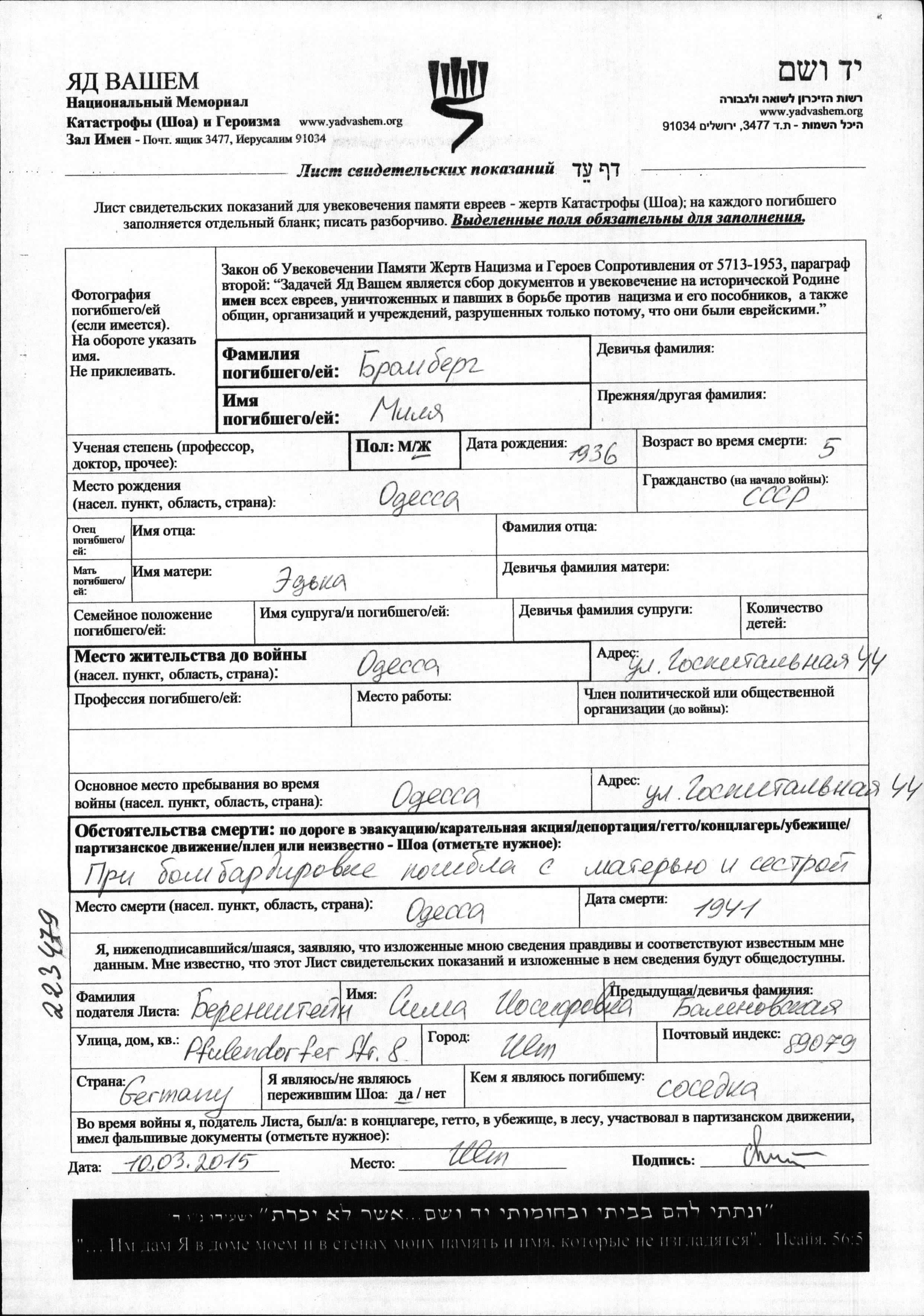 Milya wurde in der Schoah ermordet. Todesort: Odessa, Ukraine (UdSSR) im Jahr 1941.