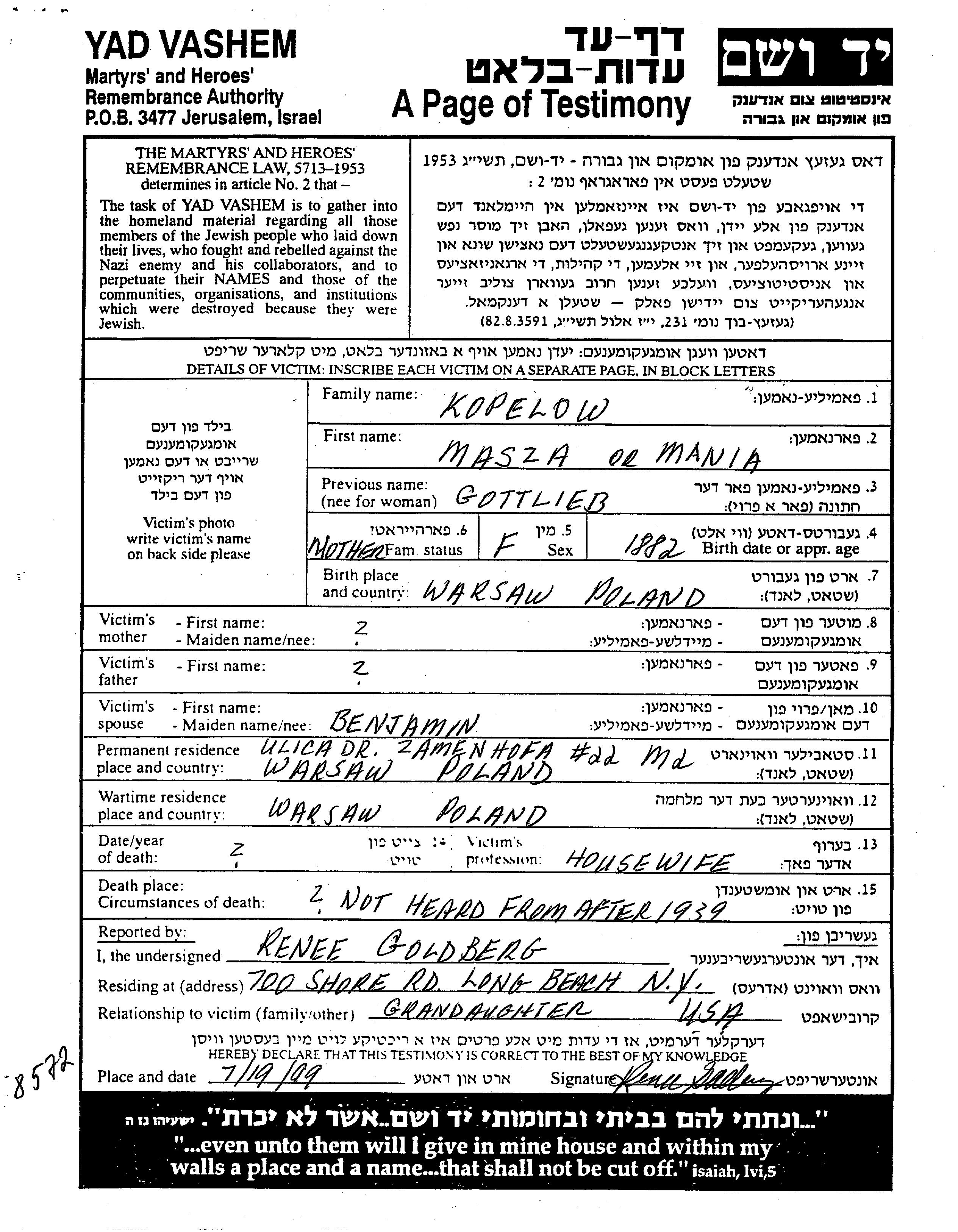 Masza Kopelow, geb. Gottlieb wurde im Jahr 1882 in Warszawa, Polen geboren. Sie war Hausfrau und mit Benjamin Verheiratet. Vor dem Zweiten Weltkrieg lebte sie in Warszawa, Polen. Während des Krieges war sie in Warszawa, Polen.