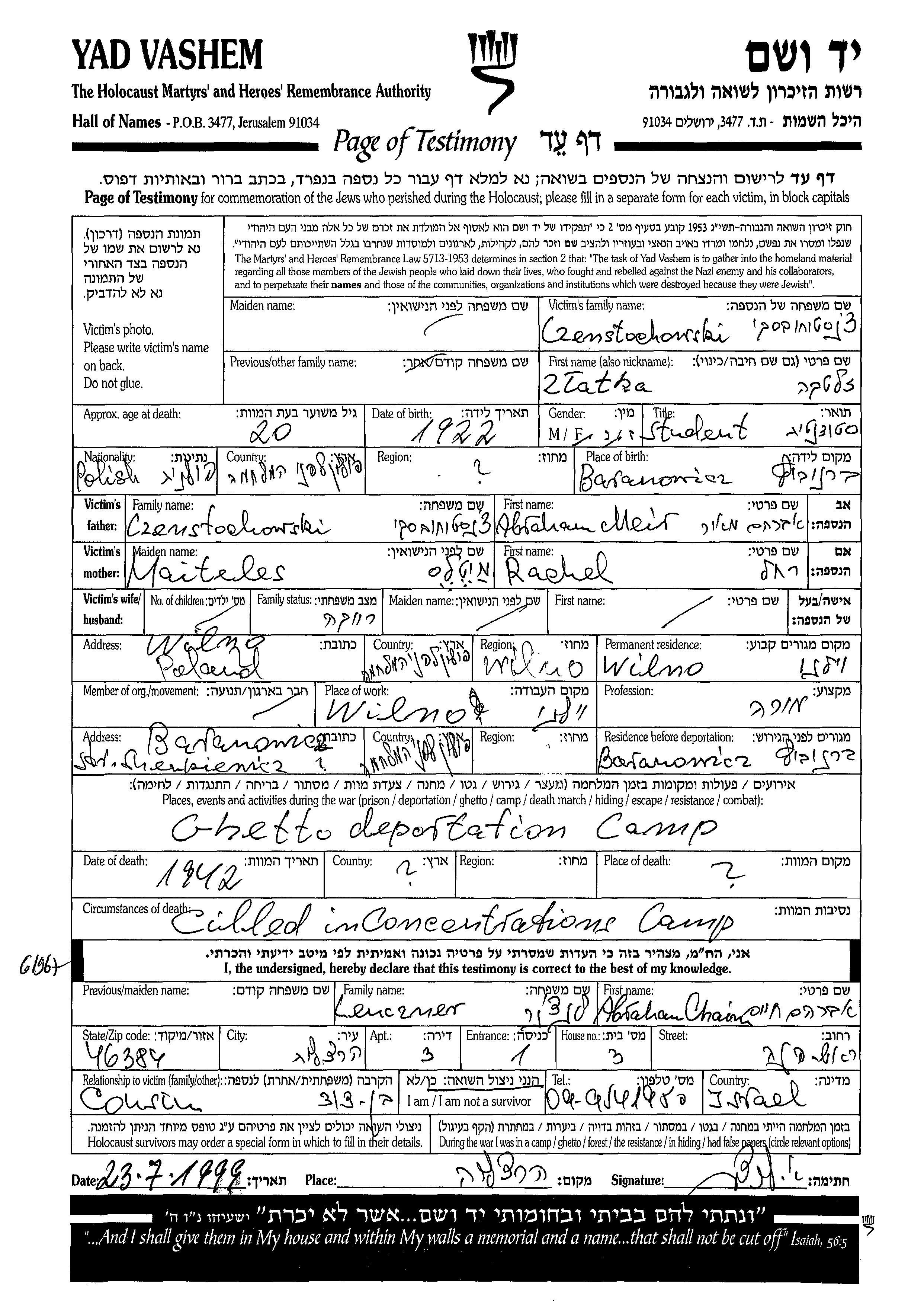 Zlatka Czenstochowski wurde im Jahr 1922 in Baranowicz, Polen geboren. Sie war die Tochter von Abraham Meir und Rachel. Sie war Lehrer/in und Ledig. Vor dem Zweiten Weltkrieg lebte sie in Wilno, Polen. Während des Krieges war sie in Baranowicz, Polen.