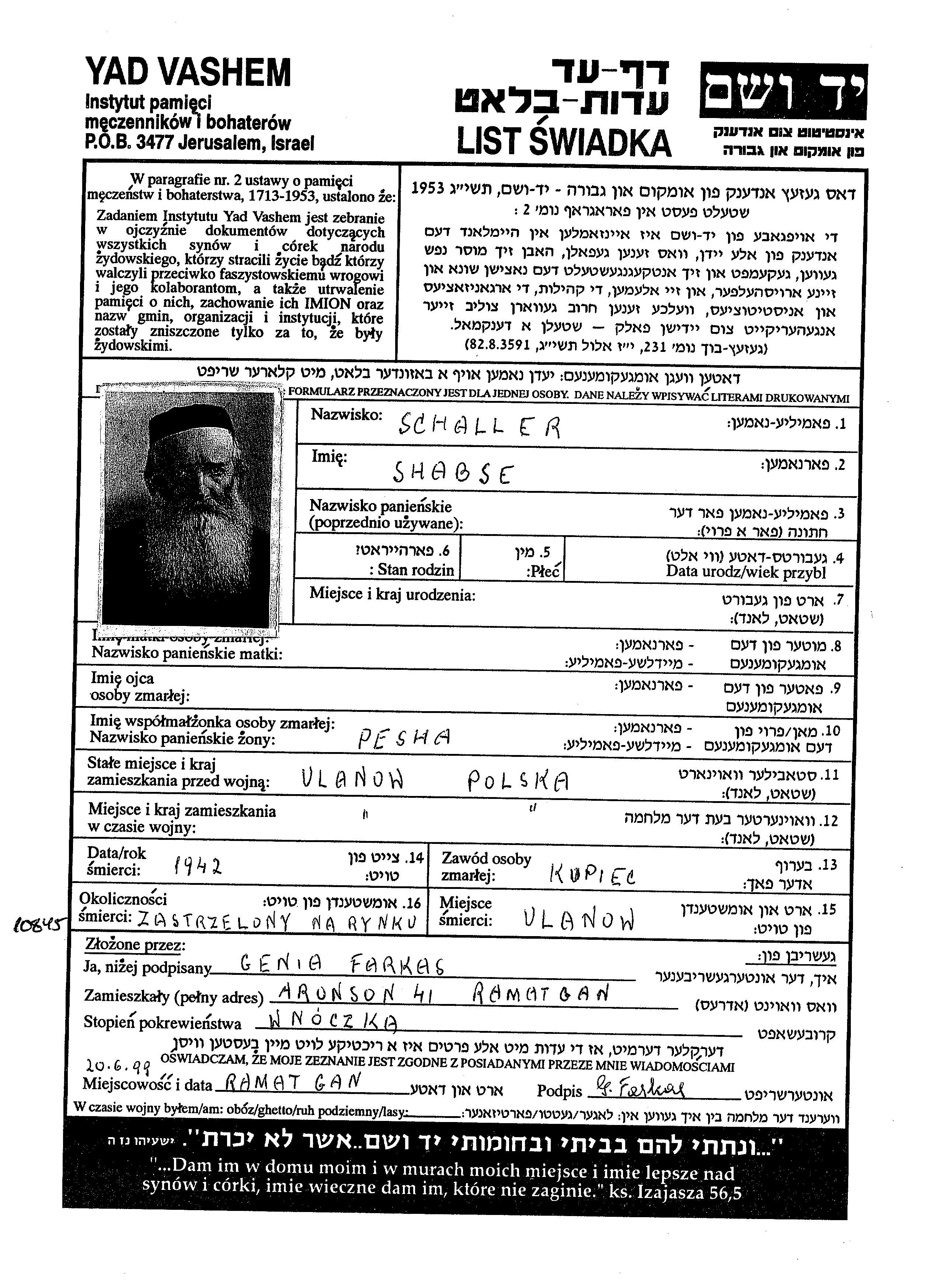 Shabse Schaller. Er war Kaufmann/-frau und mit Pesha Verheiratet. Vor dem Zweiten Weltkrieg lebte er in Ulanow, Polen. Während des Krieges war er in Ulanow, Polen.