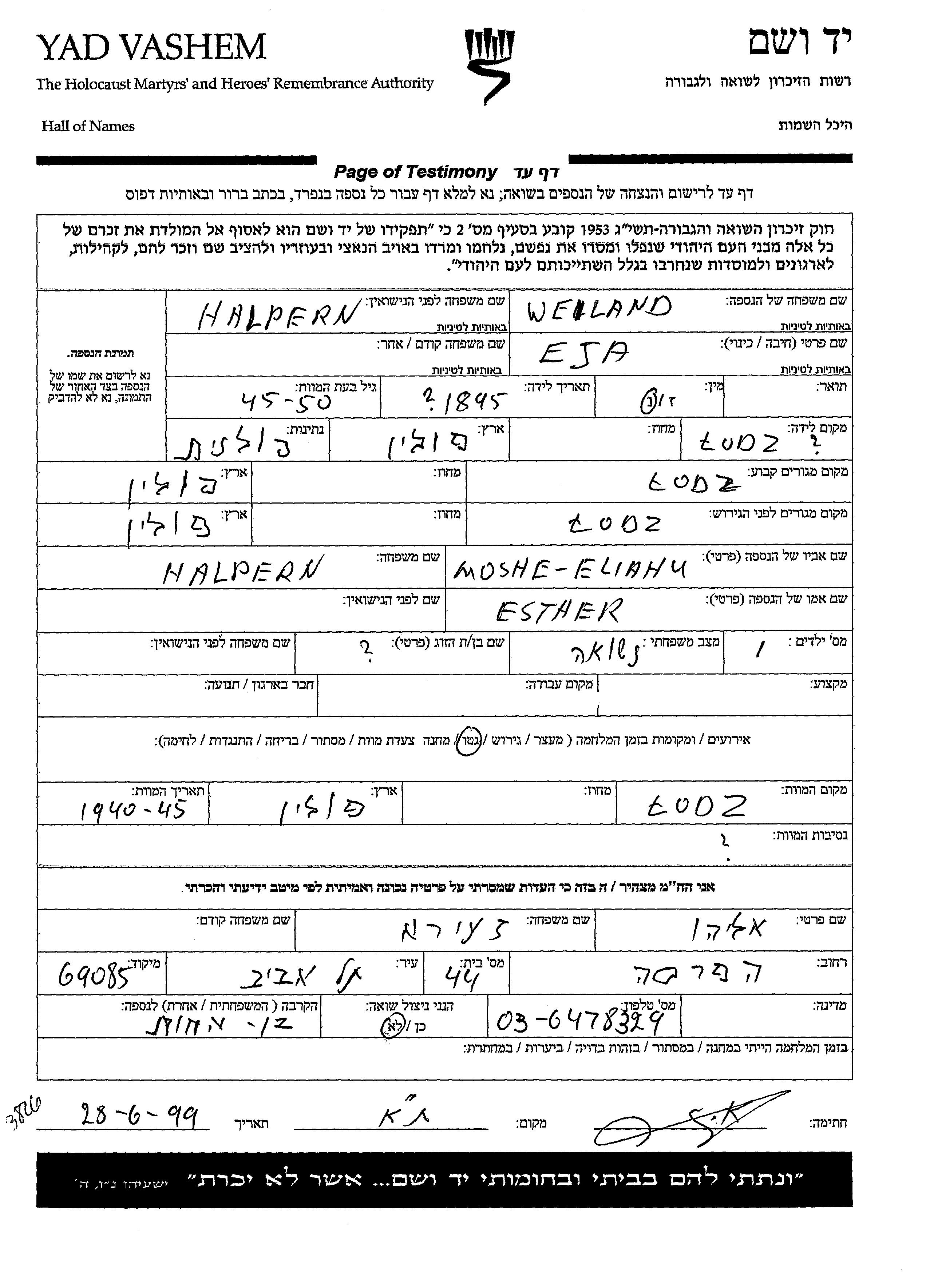 Eja Weiland, geb. Halpern wurde im Jahr 1895 in Lodz, Polen geboren. Sie war die Tochter von Moshe Eliahu und Esther. Sie war Verheiratet. Vor dem Zweiten Weltkrieg lebte sie in Lodz, Polen. Während des Krieges war sie in Lodz, Polen.