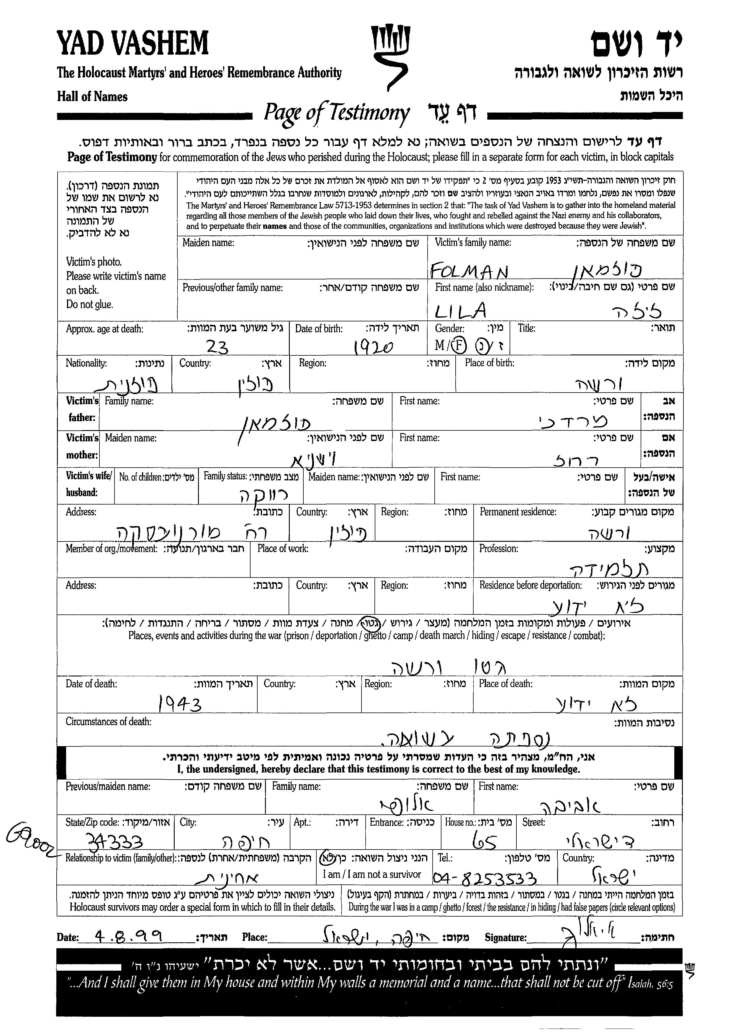Lila Fulman Folman wurde im Jahr 1920 in Warszawa, Polen geboren. Sie war die Tochter von Mordekhai und Rakhel. Sie war Schüler/-in und Ledig. Vor dem Zweiten Weltkrieg lebte sie in Warszawa, Polen. Während des Krieges war sie in Warszawa, Polen.