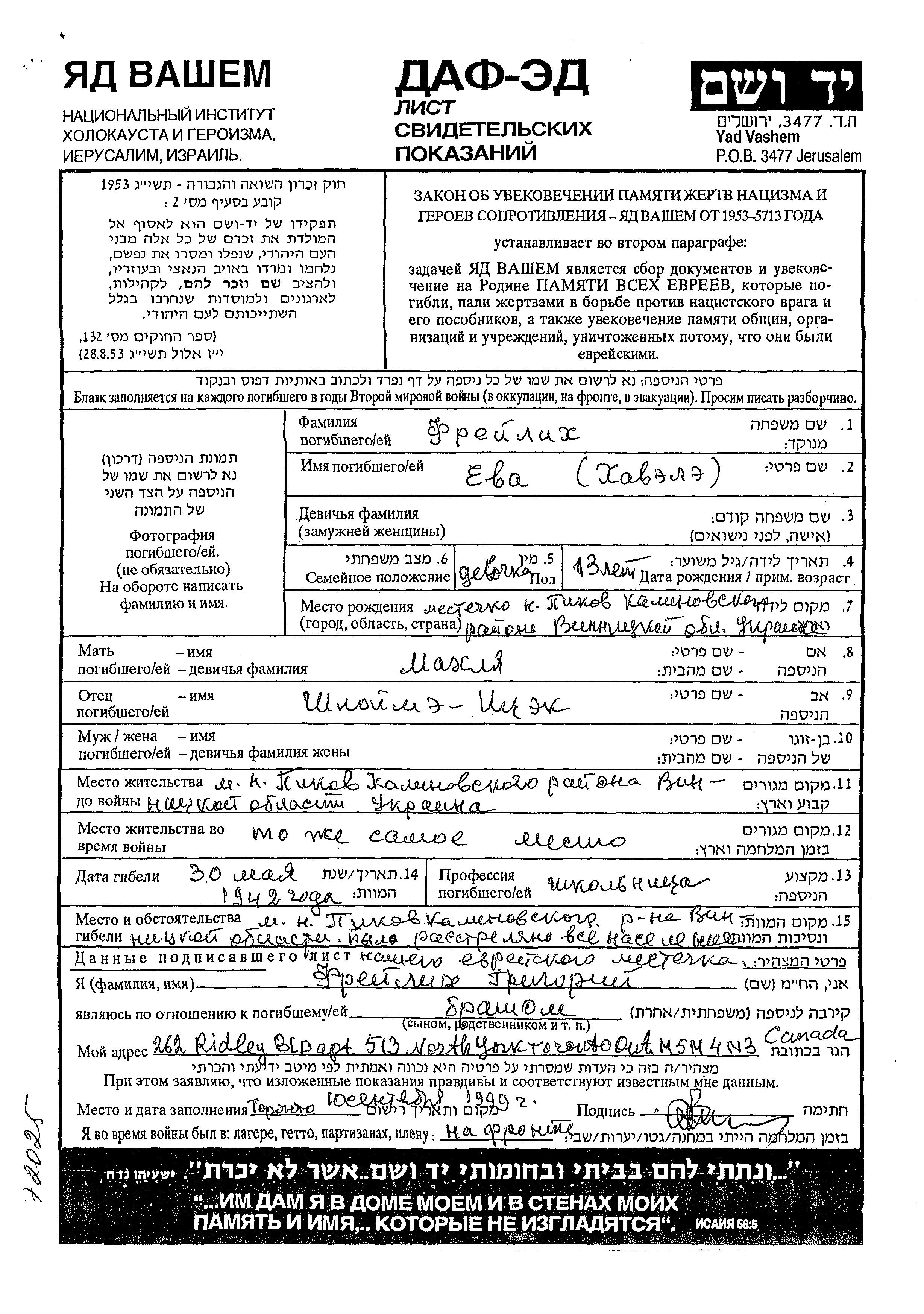 Yeva Khavale Freilikh wurde in Pikov, Ukraine (UdSSR) geboren. Sie war die Tochter von Shloime Itzek und Makhlya. Sie war Schüler/-in und Kind. Vor dem Zweiten Weltkrieg lebte sie in Pikov, Ukraine (UdSSR). Während des Krieges war sie in Pikov, Ukraine (UdSSR).