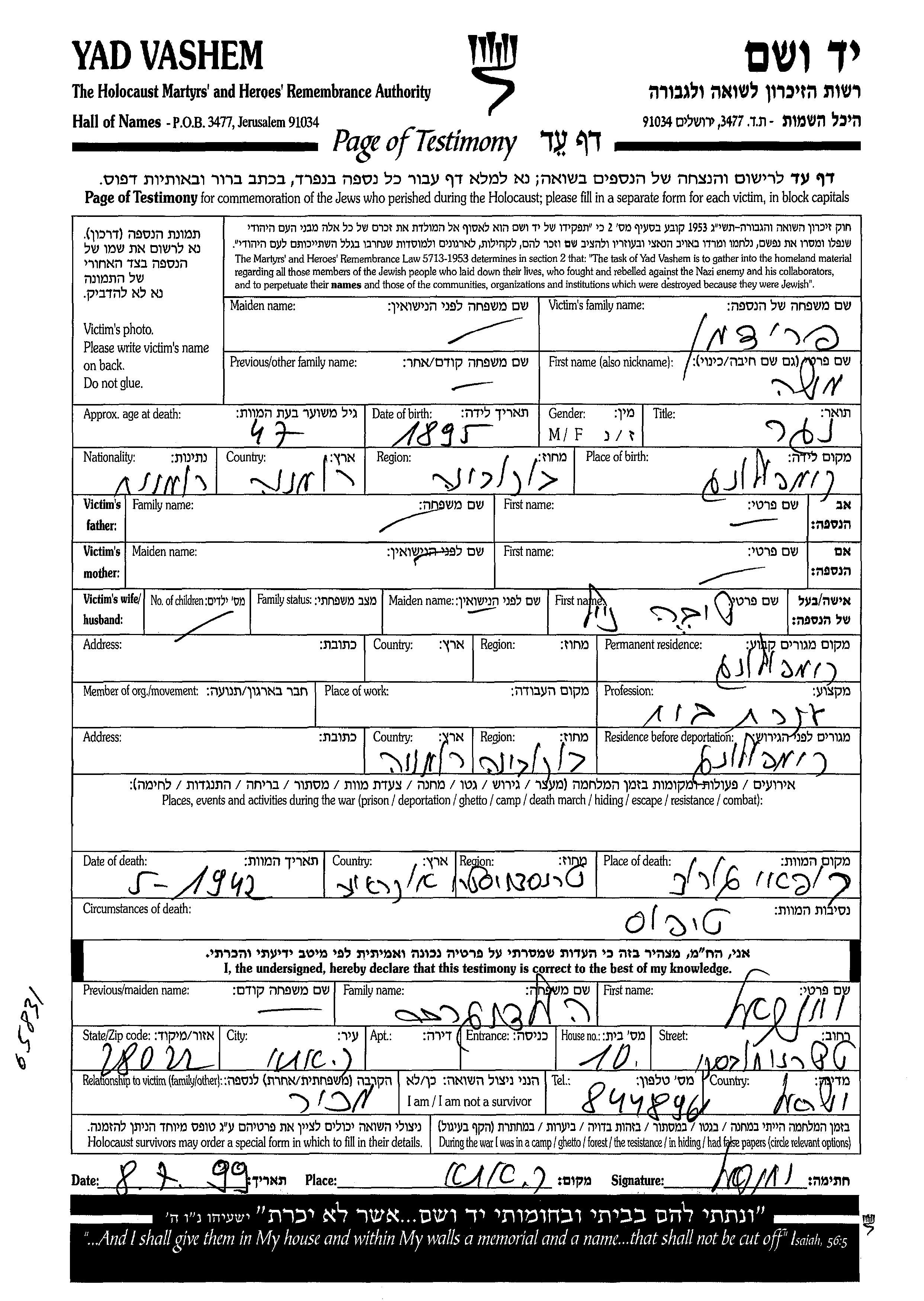 Moshe wurde in der Schoah ermordet. Todesort: Kopaygorod, Ukraine (UdSSR) im Jahr 1942.