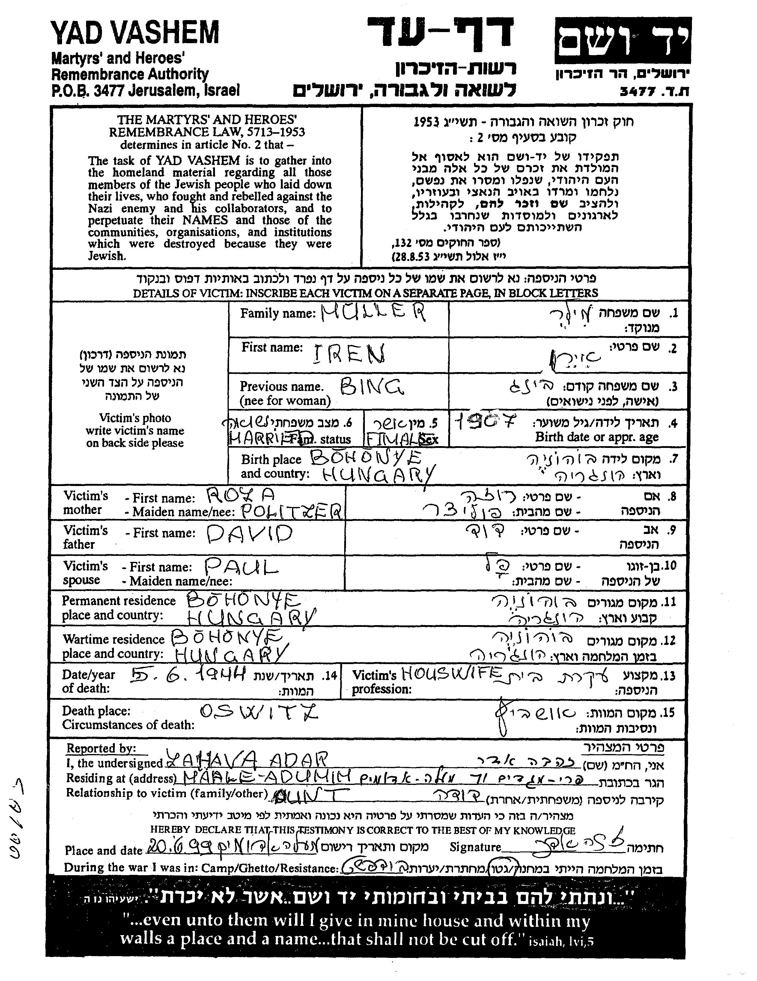 Iren Maller Miler, geb. Bing wurde im Jahr 1907 in Bohonye, Ungarn geboren. Sie war die Tochter von David und Roza. Sie war Hausfrau und mit Paul Verheiratet. Vor dem Zweiten Weltkrieg lebte sie in Bohonye, Ungarn. Während des Krieges war sie in Bohonye, Ungarn.