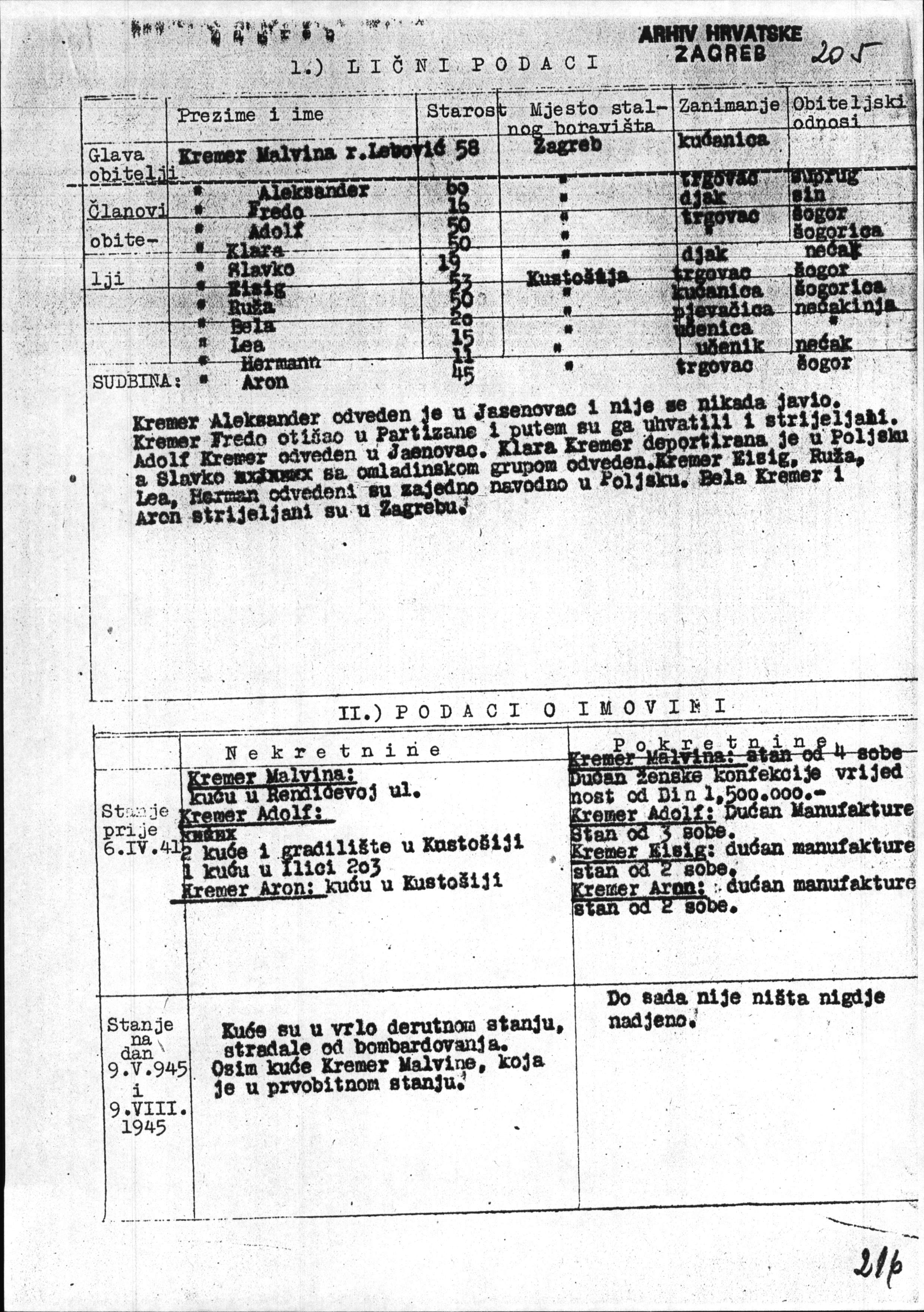 List of Jews from Zagreb and the surrounding area including their fate and details of the damage caused to their property, Letters A-W, 1945