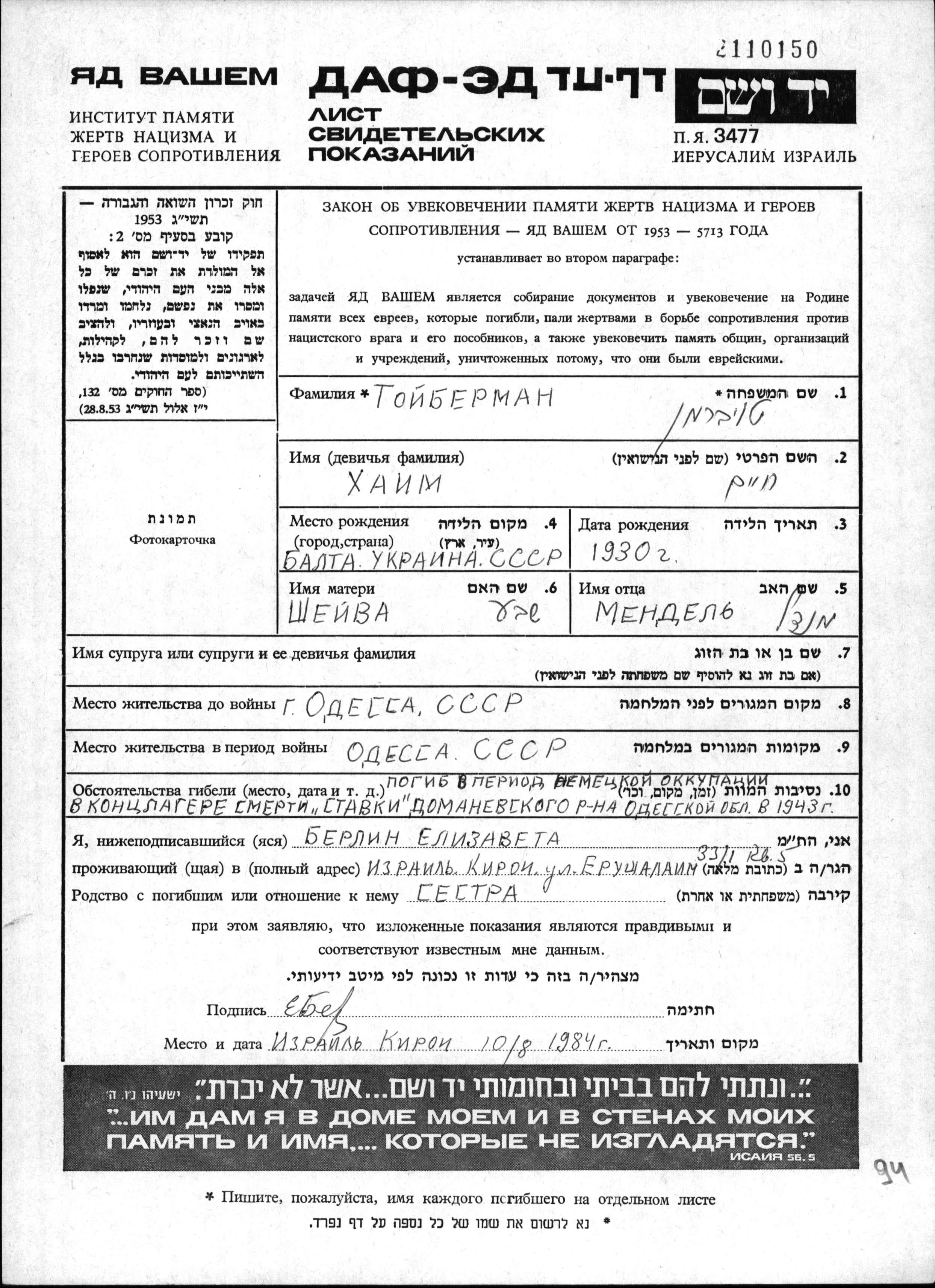 | Toiberman | Khaim | 1930 | Odessa, Ukraine (UdSSR) | Gedenkblatt |