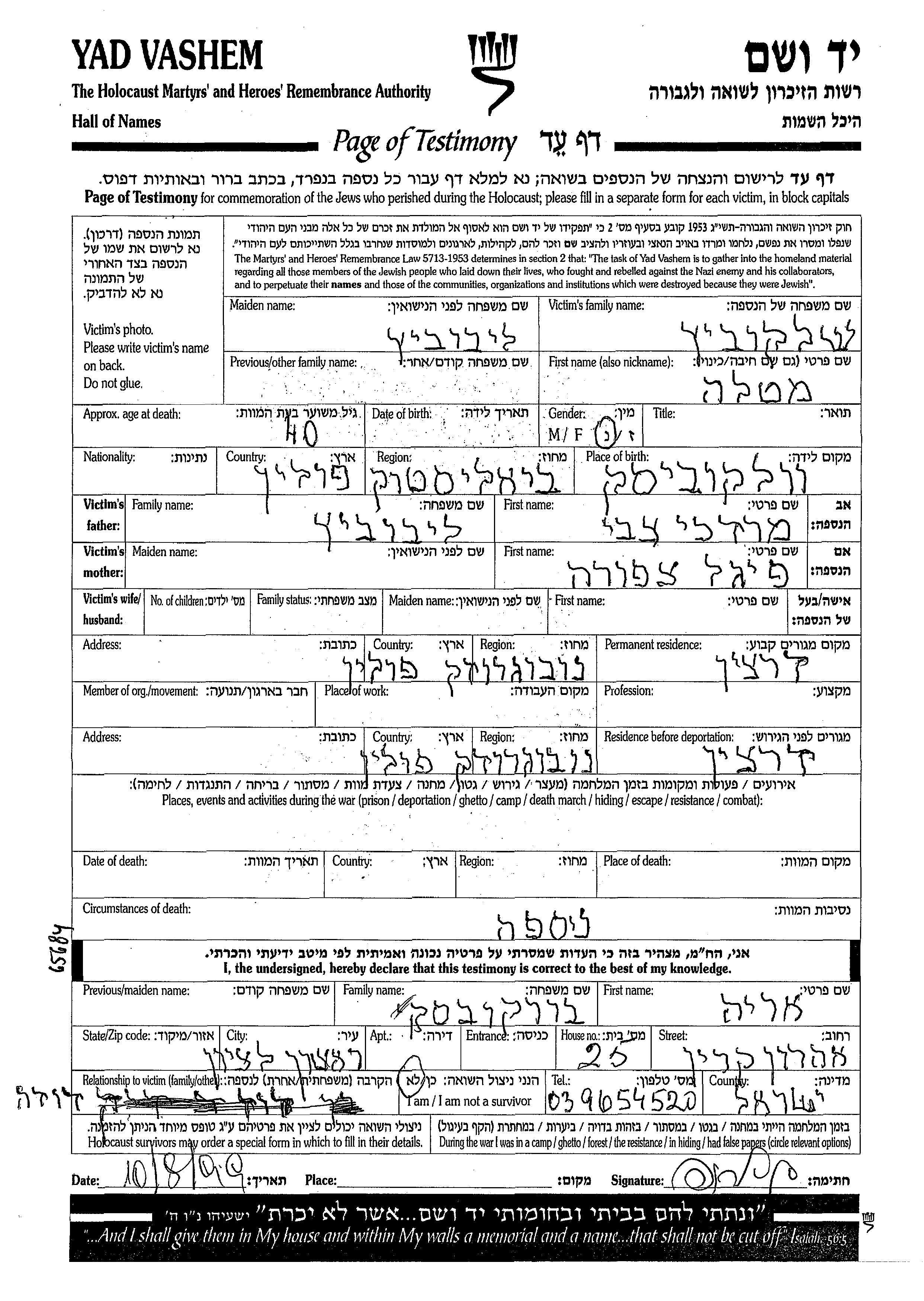 Matla Shelkovitz, geb. Libovitz wurde in Wolkowisk, Polen geboren. Sie war die Tochter von Mordechai Tzvi und Feigl Tzipora. Vor dem Zweiten Weltkrieg lebte sie in Dereczyn, Polen. Während des Krieges war sie in Dereczyn, Polen.