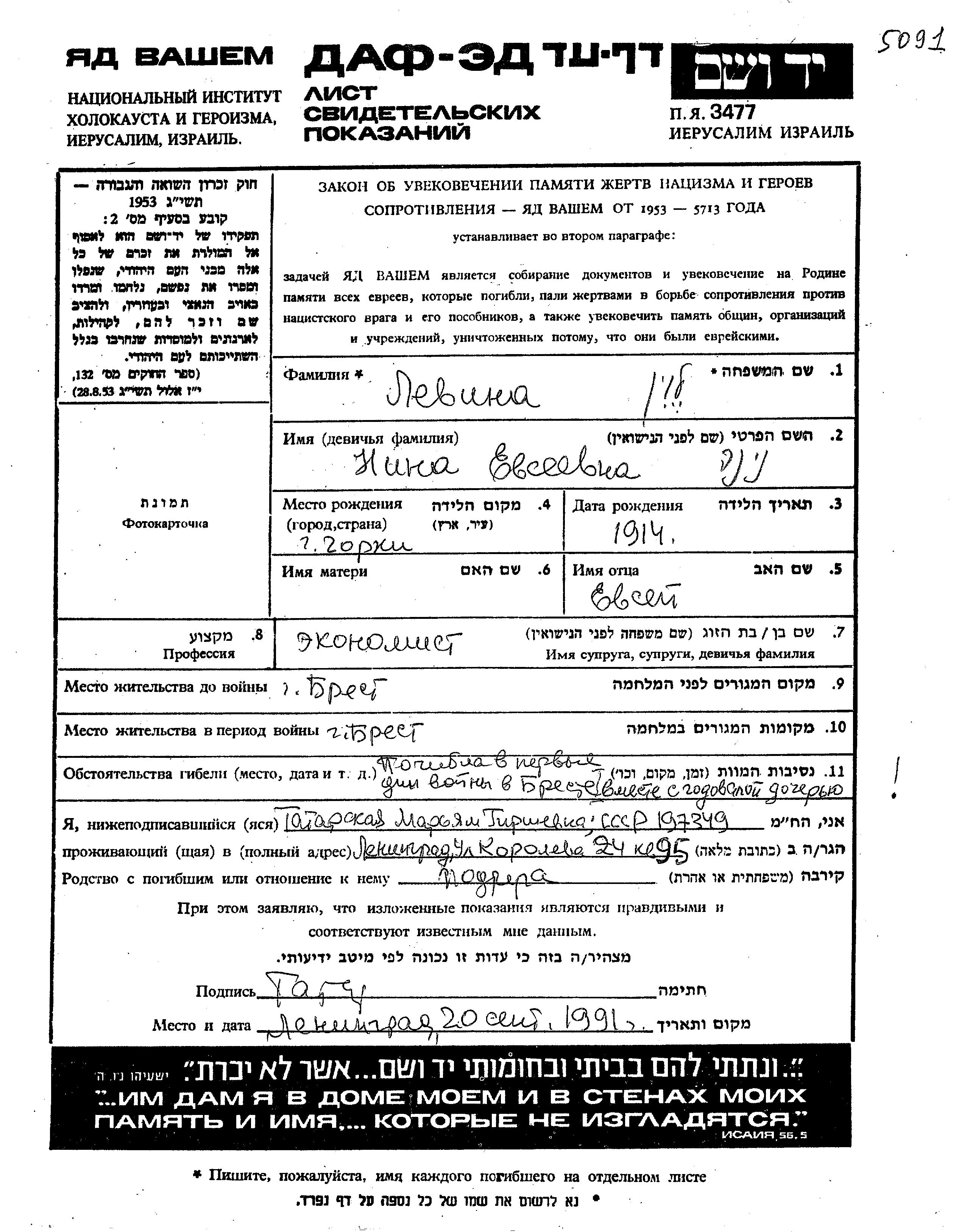 Vorname unbekannt Levin wurde Sie war die Tochter von Nina. Sie war Kind. Vor dem Zweiten Weltkrieg lebte sie in Brest, Polen. Während des Krieges war sie in Brest, Polen.