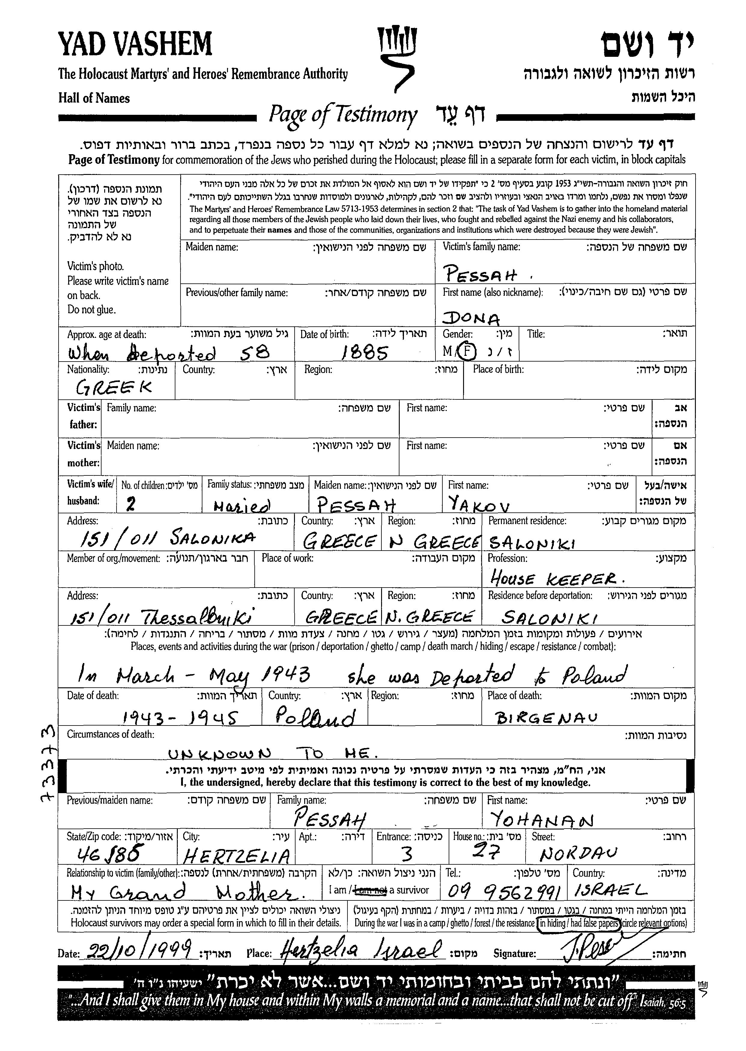 Dona Pessah wurde im Jahr 1885 in Griechenland geboren. Sie war Hausfrau und mit Yakov Verheiratet. Vor dem Zweiten Weltkrieg lebte sie in Saloniki, Griechenland. Während des Krieges war sie in Saloniki, Griechenland.