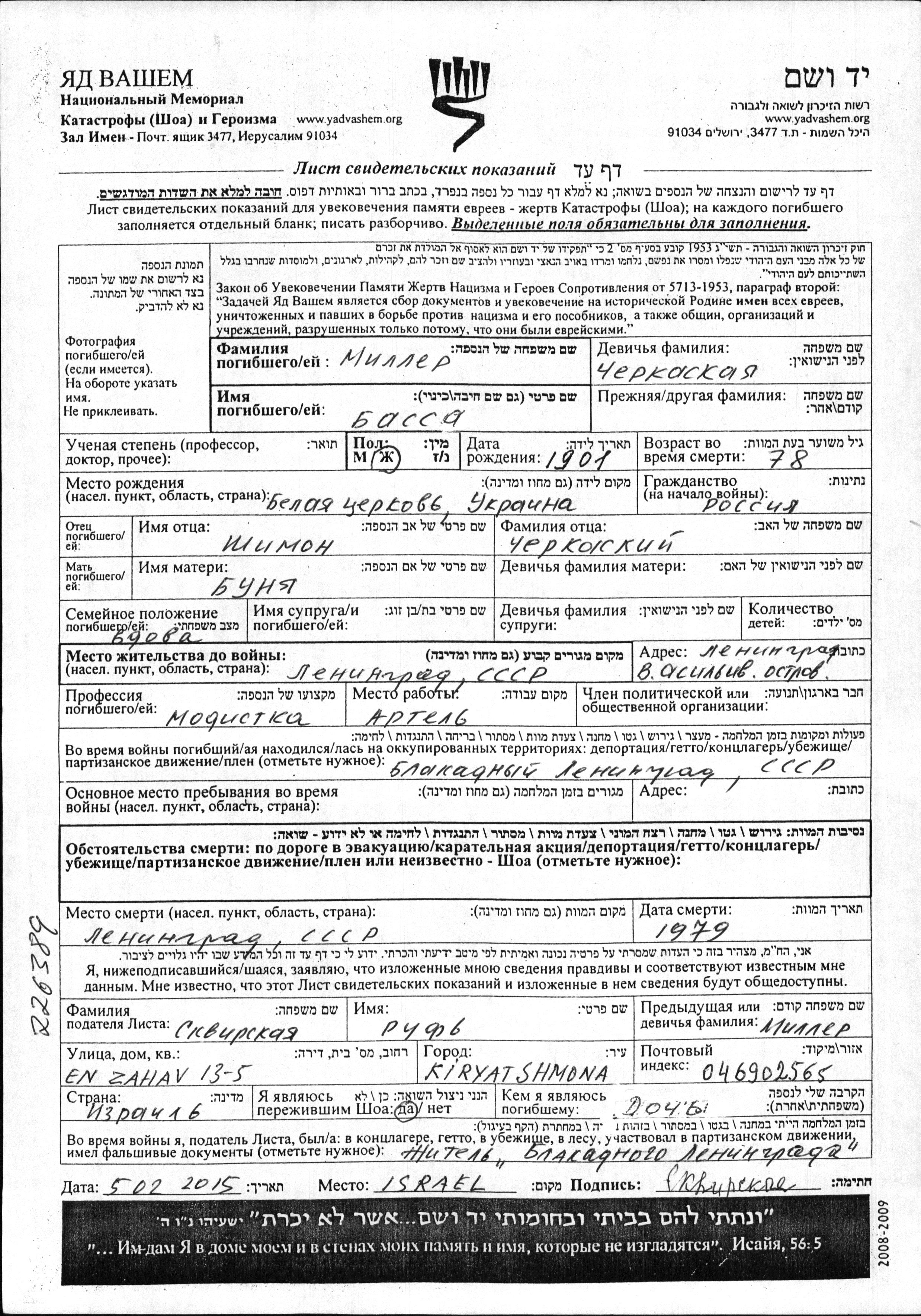 Bassa Miller, geb. Cherkaskaya wurde im Jahr 1901 in Belaya Tserkov, Ukraine (UdSSR) geboren. Sie war die Tochter von Shimon und Bunya. Sie war Witwe. Vor dem Zweiten Weltkrieg lebte sie in Leningrad, Russland (UdSSR). Während des Krieges war sie in Leningrad, Russland (UdSSR).