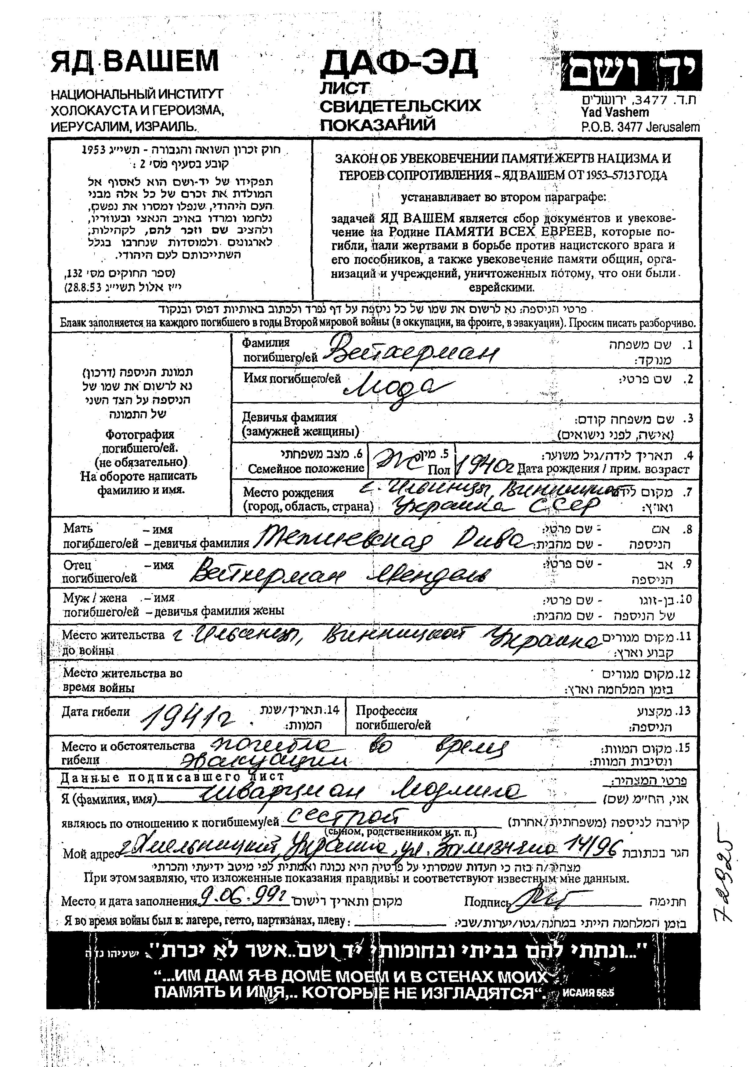 Veikherman Lyuda 1940 Ilintsy, Ukraine (UdSSR) Gedenkblatt